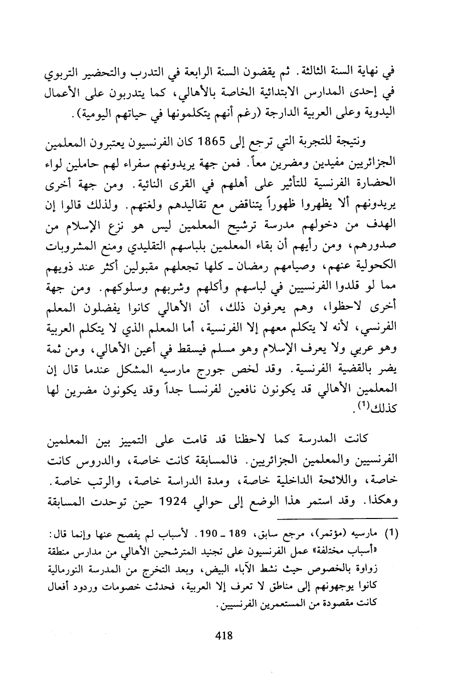 (¬1) مارسيه (مؤتمر)، مرجع سابق، 189 - 190. لأسباب لم يفصح عنها وإنما قال: (أسباب مختلفة) عمل الفرنسيون على تجنيد المترشحين الأهالي من مدارس منطقة زواوة بالخصوص حيث نشط الآباء البيض، وبعد التخرج من المدرسة النورمالية كانوا يوجهونهم إلى مناطق لا تعرف إلا العربية، فحدثت خصومات وردود أفعال كانت مقصودة من المستعمرين الفرنسيين.