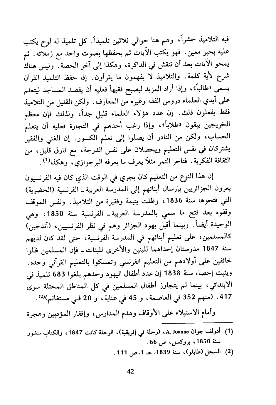 إن هذا النوع من التعليم كان يجري في الوقت الذي كان فيه الفرنسيون يغرون الجزائريين بإرسال أبنائهم إلى المدرسة العربية - الفرنسية (الحضرية) التي فتحوها سنة 1836، وظلت يتيمة وفقيرة من التلاميذ. ونفس الموقف وقفوه بعد فتح ما سمي بالمدرسة العربية - الفرنسية سنة 1850، وهي الوحيدة أيضا. وبينما أقبل يهود الجزائر وهم في نظر الفرنسيين، (أندجين) كالمسلمين، على تعليم أبنائهم في المدرسة الفرنسية، حتى لقد كان لديهم سنة 1847 مدرستان إحداهما للبنين والأخرى للبنات - فإن المسلمين ظلوا خائفين على أولادهم من التعليم الفرنسي وتمسكوا بالتعليم القرآني وحده. ويثبت إحصاء سنة 1838 إن عدد أطفال اليهود وحدهم بلغوا 683 تلميذ في الابتدائي، بينما لم يتجاوز أطفال المسلمين في كل المناطق المحتلة سوى 417. (منهم 352 في العاصمة، و 45 في عنابة، و 20 في مستغانم) (¬2). وأمام الاستيلاء على الأوقاف وهدم المدارس، وإفقار المؤدبين وهجرة