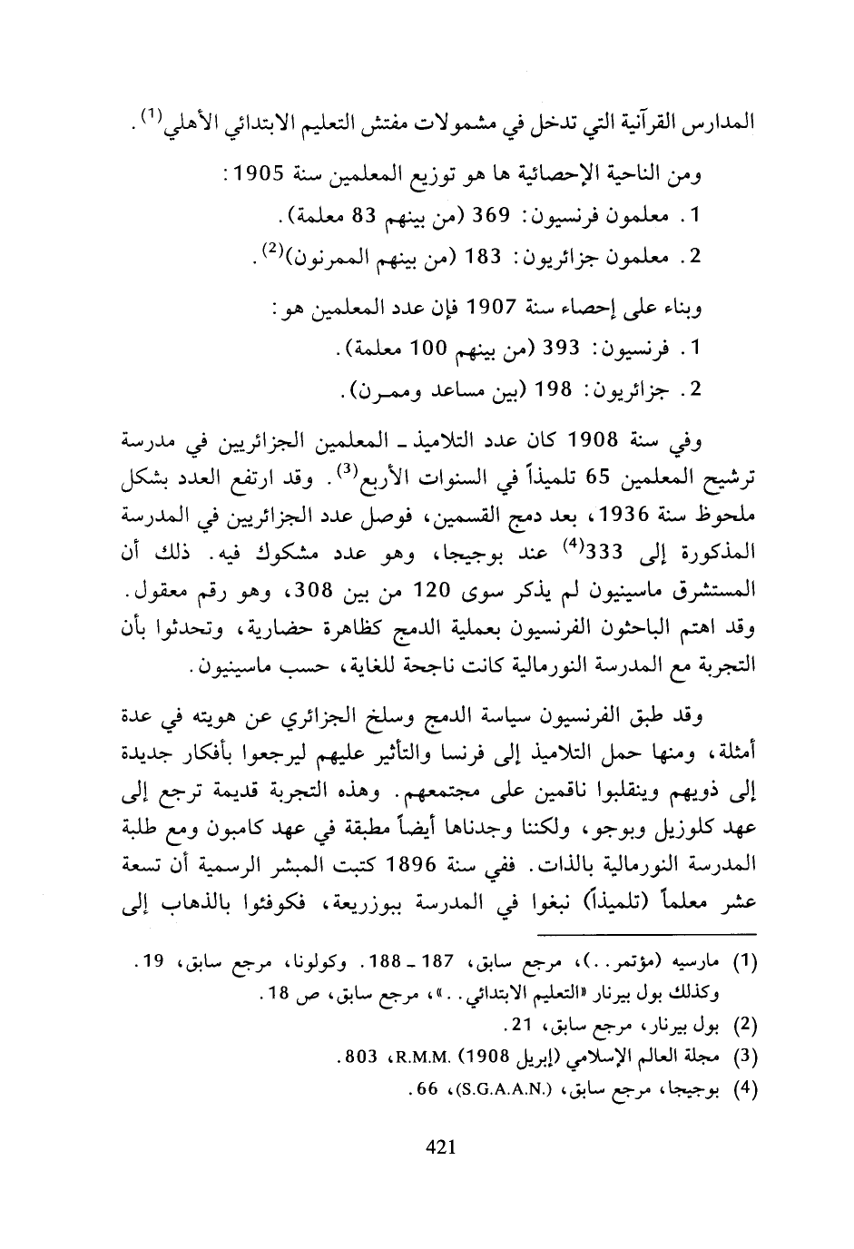 وفي سنة 1908 كان عدد التلاميذ - المعلمين الجزائريين في مدرسة ترشيح المعلمين 65 تلميذا في السنوات الأربع (¬3). وقد ارتفع العدد بشكل ملحوظ سنة 1936، بعد دمج القسمين، فوصل عدد الجزائريين في المدرسة المذكورة إلى 333 (¬4) عند بوجيجا، وهو عدد مشكوك فيه. ذلك أن المستشرق ماسينيون لم يذكر سوى 120 من بين 308، وهو رقم معقول. وقد اهتم الباحثون الفرنسيون بعملية الدمج كظاهرة حضارية، وتحدثوا بأن التجربة مع المدرسة النورمالية كانت ناجحة للغاية، حسب ماسينيون.