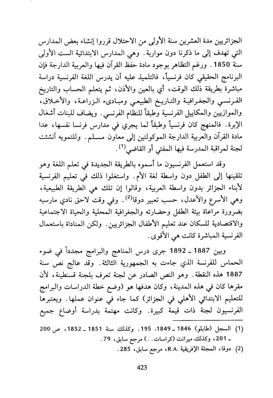الجزائريين مدة العشرين سنة الأولى من الاحتلال قرروا إنشاء بعض المدارس التي تهدف إلى ما ذكرنا دون مواربة. وهي المدارس الابتدائية الست الأولى سنة 1850. ورغم التظاهر بوجود مادة حفظ القرآن فيها والعربية الدارجة فإن البرنامج الحقيقي كان فرنسيا، فالتلميذ عليه أن يدرس اللغة الفرنسية دراسة مباشرة بطريقة ذلك الوقت، أي بالعين والأذن، ثم يتعلم الحساب والتاريخ الفرنسي والجغرافية والتاريخ الطبيعي ومبادئ الزراعة، والأخلاق، والموازيين والمكاييل الفرنسية وطبقا للنظام الفرنسي. ويضاف للبنات أشغال الإبرة. فالمنهج كان فرنسيا وطبقا لما يجري في مدارس فرنسا نفسها، عدا مادة القرآن والعربية الدارجة الموكولتين إلى معاون مسلم. وللتمويه أنشئت لجنة لمراقبة المدرسة فيها المفتي أو القاضي (¬1).
