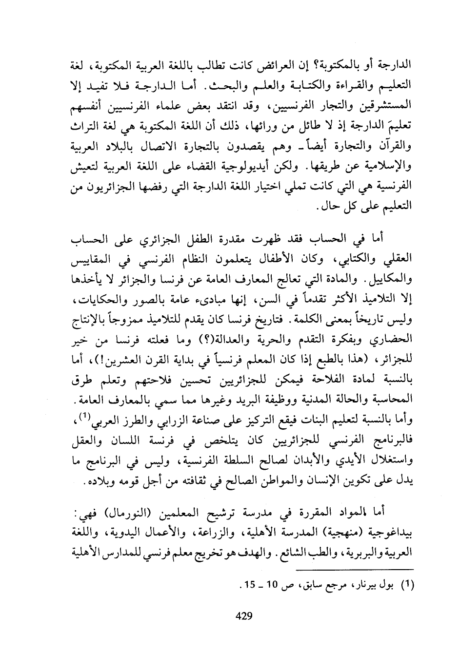 أما في الحساب فقد ظهرت مقدرة الطفل الجزائري على الحساب العقلي والكتابي، وكان الأطفال يتعلمون النظام الفرنسي في المقاييس والمكاييل. والمادة التي تعالج المعارف العامة عن فرنسا والجزائر لا يأخذها إلا التلاميذ الاكثر تقدما في السن، إنها مبادئ عامة بالصور والحكايات، وليس تاريخا بمعنى الكلمة. فتاريخ فرنسا كان يقدم للتلاميذ ممزوجا بالإنتاج الحضاري وبفكرة التقدم والحرية والعدالة (؟) وما فعلته فرنسا من خير للجزائر، (هذا بالطبع إذا كان المعلم فرنسيا في بداية القرن العشرين)، أما بالنسبة لمادة الفلاحة فيمكن للجزائريين تحسين فلاحتهم وتعلم طرق المحاسبة والحالة المدنية ووظيفة البريد وغيرها مما سمي بالمعارف العامة. وأما بالنسبة لتعليم البنات فيقع التركيز على صناعة الزرابي والطرز العربي (¬1)، فالبرنامج الفرنسي للجزائريين كان يتلخص في فرنسة اللسان والعقل واستغلال الأيدي والأبدان لصالح السلطة الفرنسية، وليس في البرنامج ما يدل على تكوين الإنسان والمواطن الصالح في ثقافته من أجل قومه وبلاده.