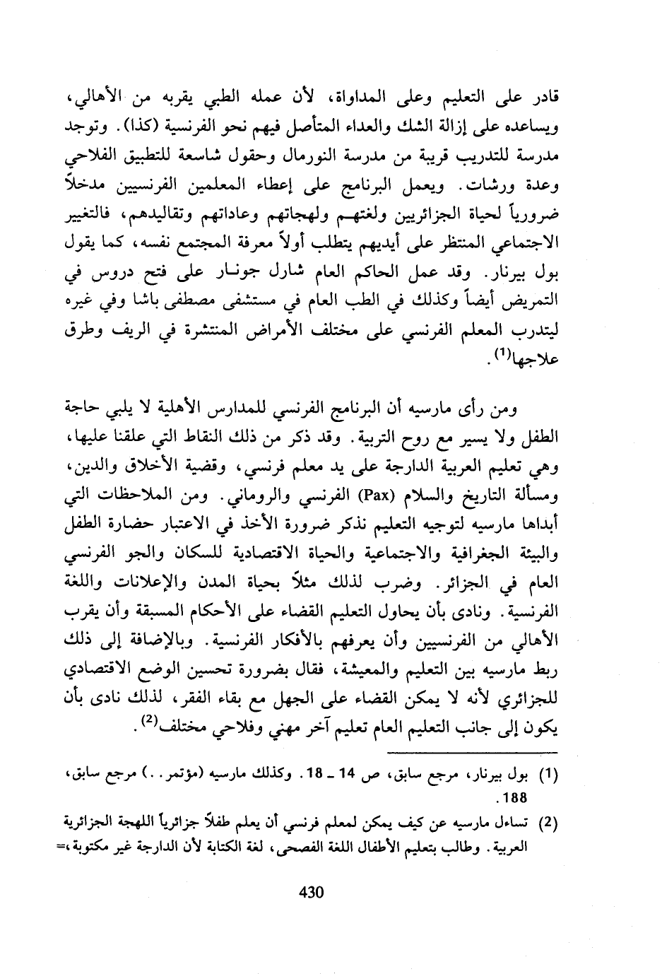قادر على التعليم وعلى المداواة، لأن عمله الطبي يقربه من الأهالي، ويساعده على إزالة الشك والعداء المتأصل فيهم نحو الفرنسية (كذا). وتوجد مدرسة للتدريب قريبة من مدرسة النورمال وحقول شاسعة للتطبيق الفلاحي وعدة ورشات. ويعمل البرنامج على إعطاء المعلمين الفرنسيين مدخلا ضروريا لحياة الجزائريين ولغتهم ولهجاتهم وعاداتهم وتقاليدهم، فالتغيير الاجتماعي المنتظر على أيديهم يتطلب أولا معرفة المجتمع نفسه، كما يقول بول بيرنار. وقد عمل الحاكم العام شارل جونار على فتح دروس في التمريض أيضا وكذلك في الطب العام في مستشفى مصطفى باشا وفي غيره ليتدرب المعلم الفرنسي على مختلف الأمراض المنتشرة في الريف وطرق علاجها (¬1).