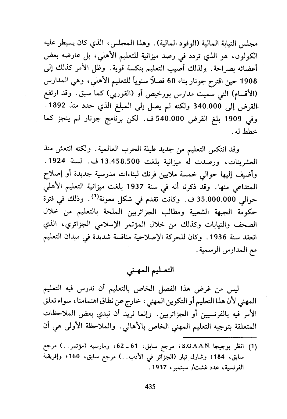 (¬1) انظر بوجيجا. S.G.A.A.N مرجع سابق، 61 - 62، ومارسيه (مؤتمر ..) مرجع سابق، 184، وشارل تيار (الجزائر في الأدب ..) مرجع سابق، 160، وإفريقية الفرنسية، عدد غشت/ سبتمبر، 1937.