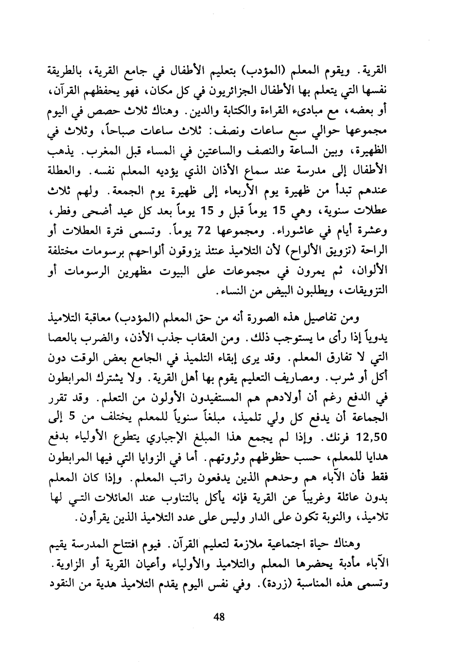 القرية. ويقوم المعلم (المؤدب) بتعليم الأطفال في جامع القرية، بالطريقة نفسها التي يتعلم بها الأطفال الجزائريون في كل مكان، فهو يحفظهم القرآن، أو بعضه، مع مبادئ القراءة والكتابة والدين. وهناك ثلاث حصص في اليوم مجموعها حوالي سبع ساعات ونصف: ثلاث ساعات صباحا، وثلاث في الظهيرة، وبين الساعة والنصف والساعتين في المساء قبل المغرب. يذهب الأطفال إلى مدرسة عند سماع الأذان الذي يؤديه المعلم نفسه. والعطلة عندهم تبدأ من ظهيرة يوم الأربعاء إلى ظهيرة يوم الجمعة. ولهم ثلاث عطلات سنوية، وهي 15 يوما قبل و 15 يوما بعد كل عيد أضحى وفطر، وعشرة أيام في عاشوراء. ومجموعها 72 يوما. وتسمى فترة العطلات أو الراحة (تزويق الألواح) لأن التلاميذ عنئذ يزوقون ألواحهم برسومات مختلفة الألوان، ثم يمرون في مجموعات على البيوت مظهرين الرسومات أو التزويقات، ويطلبون البيض من النساء.