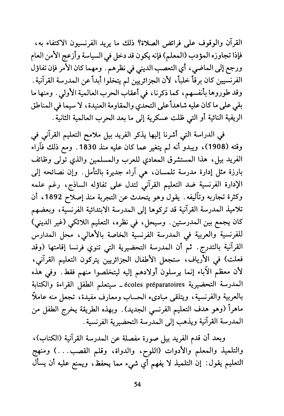 في الدراسة التي أشرنا إليها يذكر الفريد بيل ملامح التعليم القرآني في وقته (1908)، ويبدو أنه لم يتغير عما كان عليه منذ 1830. ومع ذلك فآراء الفريد بيل، هذا المستشرق المعادي للعرب والمسلمين والذي تولى وظائف بارزة مثل إدارة مدرسة تلمسان، هي آراء جديرة بالتأمل. وإن نصائحه إلى الإدارة الفرنسية ضد التعليم القرآني لتدل على تفاؤله الساذج، رغم علمه وكثرة تجاربه وتآليفه. يقول وهو يتحدث عن التجربة منذ إصلاح 1892، أن تلاميذ المدرسة القرآنية قد تركوها إلى المدرسة الابتدائية الفرنسية، وبعضهم كان يجمع بين المدرستين. وسيحل، في نظره، التعليم اللائكي (غير الديني) للفرنسية والعربية في المدرسة الفرنسية الخاصة بالأهالي، محل المدارس القرآنية بالتدرج. ثم أن المدرسة التحضيرية التي تنوي فرنسا إقامتها (وقد فعلت) في الأرياف، ستجعل الأطفال الجزائريين يتركون التعليم القرآني، لأن معظم الآباء إنما يرسلون أولادهم إليه ليتخلصوا منهم فقط. وفي هذه المدرسة التحضيرية écoles préparatoires - سيتعلم الطفل القراءة والكتابة بالعربية والفرنسية، ويتلقى مبادئ الحساب ومعارف مفيدة، تجعل منه عاملا ماهرا (وهو هدف التعليم الفرنسي الجديد). وبهذه الطريقة يخرج الطفل من المدرسة القرآنية ويذهب إلى المدرسة التحضيرية الفرنسية.