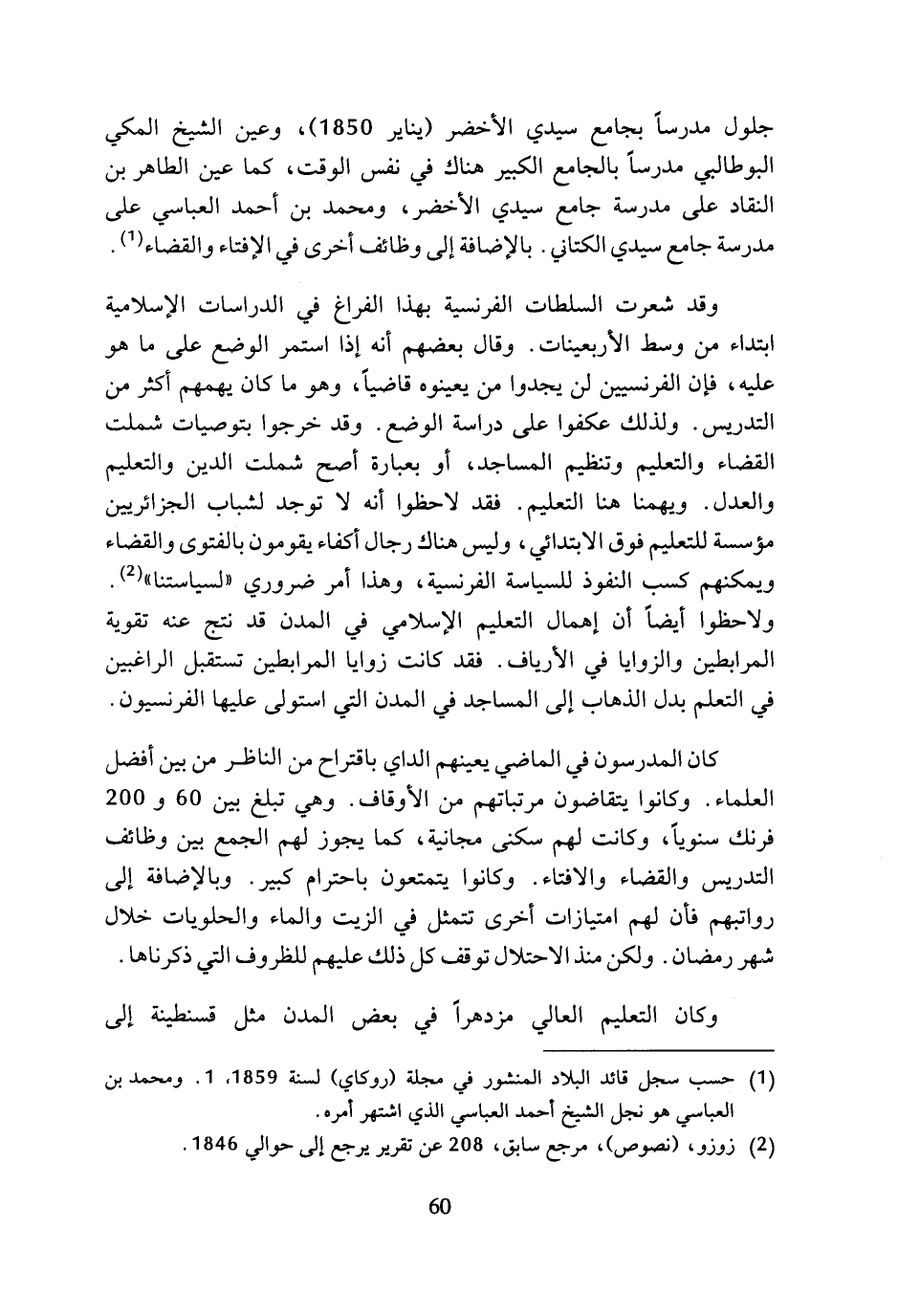 وقد شعرت السلطات الفرنسية بهذا الفراغ في الدراسات الإسلامية ابتداء من وسط الأربعينات. وقال بعضهم أنه إذا استمر الوضع على ما هو عليه، فإن الفرنسيين لن يجدوا من يعينوه قاضيا، وهو ما كان يهمهم أكثر من التدريس. ولذلك عكفوا على دراسة الوضع. وقد خرجوا بتوصيات شملت القضاء والتعليم وتنظيم المساجد، أو بعبارة أصح شملت الدين والتعليم والعدل. ويهمنا هنا التعليم. فقد لاحظوا أنه لا توجد لشباب الجزائريين مؤسسة للتعليم فوق الابتدائي، وليس هناك رجال أكفاء يقومون بالفتوى والقضاء ويمكنهم كسب النفوذ للسياسة الفرنسية، وهذا أمر ضروري (لسياستنا) (¬2). ولاحظوا أيضا أن إهمال التعليم الإسلامي في المدن قد نتج عنه تقوية المرابطين والزوايا في الأرياف. فقد كانت زوايا المرابطين تستقبل الراغبين في التعلم بدل الذهاب إلى المساجد في المدن التي استولى عليها الفرنسيون. كان المدرسون في الماضي يعينهم الداي باقتراح من الناظر من بين أفضل العلماء. وكانوا يتقاضون مرتباتهم من الأوقاف. وهي تبلغ بين 60 و 200 فرنك سنويا، وكانت لهم سكنى مجانية، كما يجوز لهم الجمع بين وظائف التدريس والقضاء والافتاء. وكانوا يتمتعون باحترام كبير. وبالإضافة إلى رواتبهم فأن لهم امتيازات أخرى تتمثل في الزيت والماء والحلويات خلال شعهر رمضان. ولكن منذ الاحتلال توقف كل ذلك عليهم للظروف التي ذكرناها. وكان التعليم العالي مزدهرا في بعض المدن مثل قسنطينة إلى