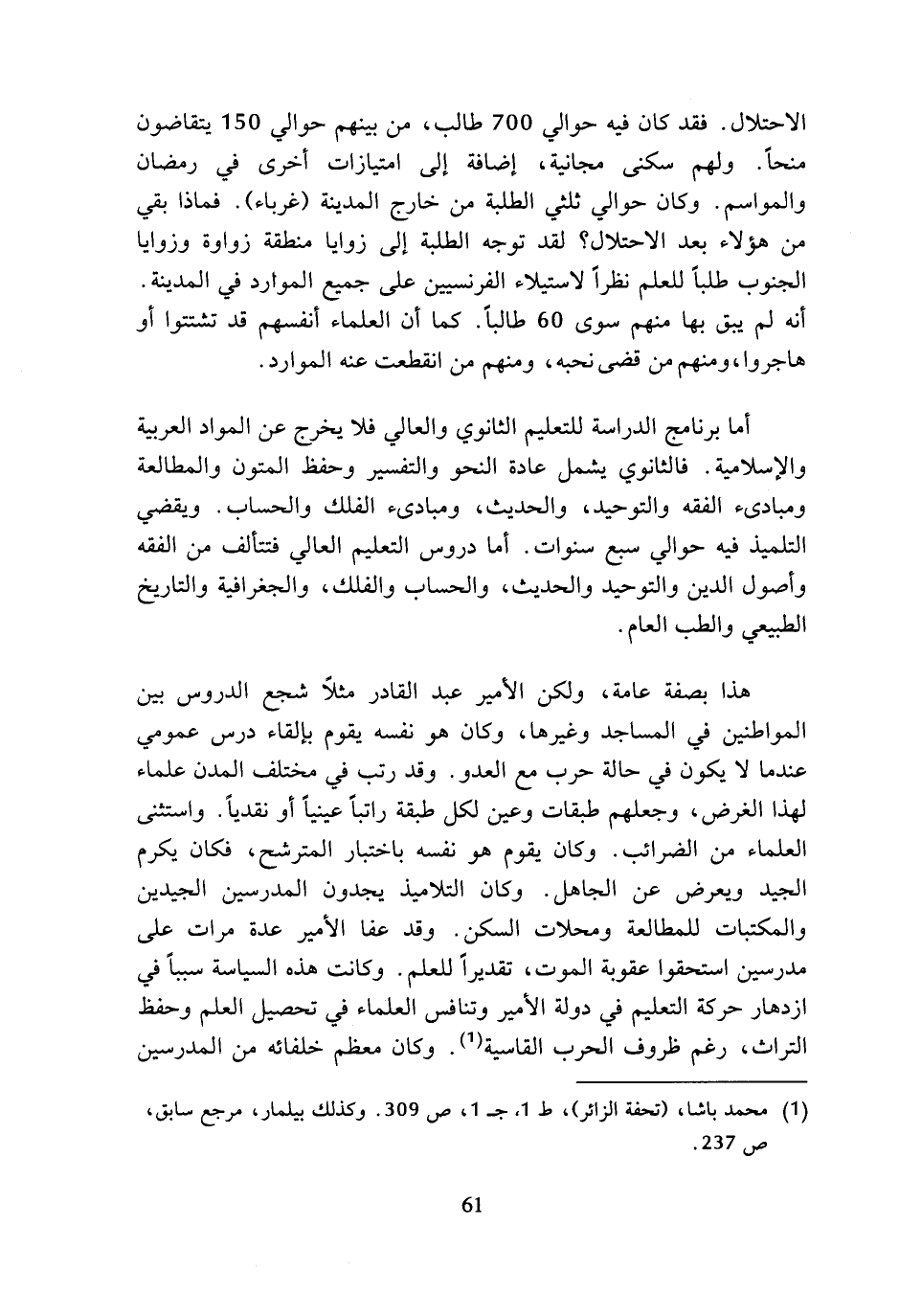 هذا بصفة عامة، ولكن الأمير عبد القادر مثلا شجع الدروس بين المواطنين في المساجد وغيرها، وكان هو نفسه يقوم بإلقاء درس عمومي عندما لا يكون في حالة حرب مع العدو. وقد رتب في مختلف المدن علماء لهذا الغرض، وجعلهم طبقات وعين لكل طبقة راتبا عينيا أو نقديا. واستثنى العلماء من الضرائب. وكان يقوم هو نفسه باختبار المترشح، فكان يكرم الجيد ويعرض عن الجاهل. وكان التلاميذ يجدون المدرسين الجيدين والمكتبات للمطالعة ومحلات السكن. وقد عفا الأمير عدة مرات على مدرسين استحقوا عقوبة الموت، تقديرا للعلم. وكانت هذه السياسة سببا في ازدهار حركة التعليم في دولة الأمير وتنافس العلماء في تحصيل العلم وحفظ التراث، رغم ظروف الحرب القاسية (¬1). وكان معظم خلفائه من المدرسين