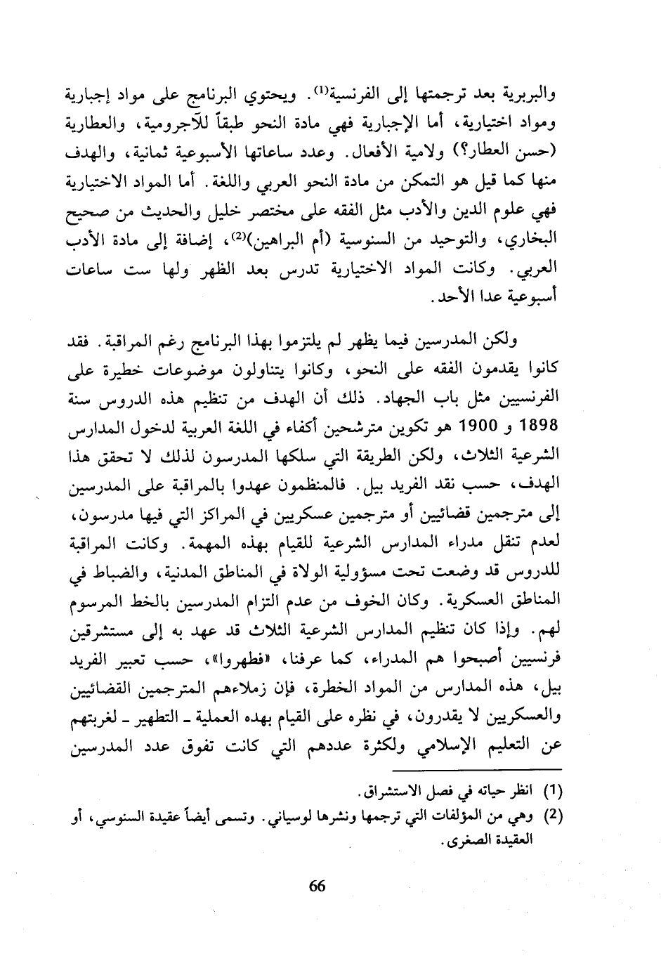 ولكن المدرسين فيما يظهر لم يلتزموا بهذا البرنامج رغم المراقبة. فقد كانوا يقدمون الفقه على النحو، وكانوا يتناولون موضوعات خطيرة على الفرنسيين مثل باب الجهاد. ذلك أن الهدف من تنظيم هذه الدروس سنة 1898 و 1955 هو تكوين مترشحين أكفاء في اللغة العربية لدخول المدارس الشرعية الثلاث، ولكن الطريقة التي سلكها المدرسون لذلك لا تحقق هذا الهدف، حسب نقد الفريد بيل. فالمنظمون عهدوا بالمراقبة على المدرسين إلى مترجمين قضائيين أو مترجمين عسكريين في المراكز التى فيها مدرسون، لعدم تنقل مدراء المدارس الشرعية للقيام بهذه المهمة. وكانت المراقبة للدروس قد وضعت تحت مسؤولية الولاة في المناطق المدنية، والضباط في المناطق العسكرية. وكان الخوف من عدم التزام المدرسين بالخط المرسوم لهم. وإذا كان تنظيم المدارس الشرعية الثلاث قد عهد به إلى مستشرقين فرنسيين أصبحوا هم المدراء، كما عرفنا، (فطهروا)، حسب تعبير الفريد بيل، هذه المدارس من المواد الخطرة، فإن زملاءهم المترجمين القضائيين والعسكريين لا يقدرون، في نظره على القيام بهذه العملية - التطهير - لغربتهم عن التعليم الإسلامي ولكثرة عددهم التي كانت تفوق عدد المدرسين