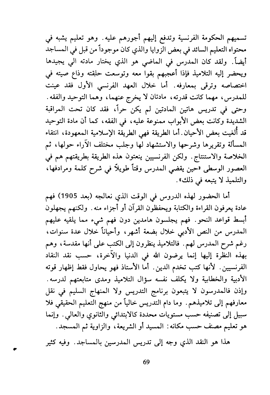 أما الحضور لهذه الدروس في الوقت الذي نعالجه (بعد 1905) فهم عادة يعرفون القراءة والكتابة ويحفظون القرآن أو أجزاء منه. ولكنهم يجهلون أبسط قواعد النحو. فهم يجلسون هامدين دون فهم شيء مما يلقيه عليهم المدرس من النص الأدبي خلال بضعة أشهر، وأحيانا خلال عدة سنوات، رغم شرح المدرس لهم. فالتلاميذ ينظرون إلى الكتب على أنها مقدسة، وهم بهذه النظرة إليها إنما يرضون الله في الدنيا والآخرة، حسب نقد النقاد الفرنسيين. لأنها كتب تخدم الدين. أما الأستاذ فهو يحاول فقط إظهار قوته الأدبية والخطابية ولا يكلف نفسه سؤال التلاميذ ومدى متابعتهم لدرسه. وإذن فالمدرسون لا يتبعون برنامج التدريس ولا المنهاج السليم في نقل معارفهم إلى تلاميذهم. وما دام التدريس خاليا من منهج التعليم الحقيقي فلا سبيل إلى تصنيفه حسب مستويات محددة كالابتدائي والثانوي والعالي. وإنما هو تعليم مصنف حسب مكانه: المسيد أو الشريعة، والزاوية ثم المسجد. هذا هو النقد الذي وجه إلى تدريس المدرسين بالمساجد. وفيه كثير