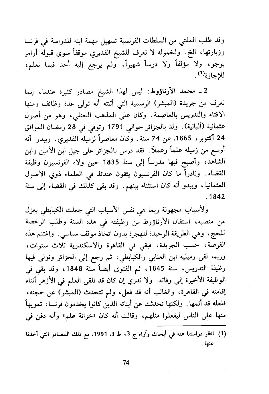 2 - محمد الأرناؤوط: ليس لهذا الشيخ مصادر كثيرة عندنا، إنما نعرف من جريدة (المبشر) الرسمية التي أبنته أنه تولى عدة وظائف ومنها الافتاء والتدريس بالعاصمة. وكان على المذهب الحنفي، وهو من أصول عثمانية (ألبانية). ولد بالجزائر حوالي 1791 وتوفي في 28 رمضان الموافق 24 أكتوبر، 1865، عن 74 سنة. وكان معاصرا لزميله القديري. ويبدو أنه أوسع من زميله علما وعملا. فقد درس بالجزائر على جيل ابن الأمين وابن الشاهد، وأصبح فيها مدرسا إلى سنة 1835 حين ولاه الفرنسيون وظيفة القضاء. ونادرا ما كان الفرنسيون يثقون عندئذ في العلماء ذوي الأصول العثمانية، ويبدو أنه كان استثناء بينهم. وقد بقى كذلك في القضاء إلى سنة 1842.