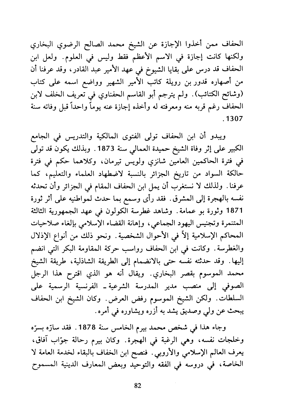 ويبدو أن ابن الحفاف تولى الفتوى المالكية والتدريس في الجامع الكبير على إثر وفاة الشيخ حميدة العمالي سنة 1873. وبذلك يكون قد تولى في فترة الحاكمين العامين شأنزي ولويس تيرمان، وكلاهما حكم في فترة حالكة السواد من تاريخ الجزائر بالنسبة لاضطهاد العلماء والتعليم، كما عرفنا. ولذلك لا نستغرب أن يمل ابن الحفاف المقام في الجزائر وأن تحدثه نفسه بالهجرة إلى المشرق. فقد رأى وسمع بما حدث لمواطنيه على أثر ثورة 1871 وثورة بو عمامة. وشاهد غطرسة الكولون في عهد الجمهورية الثالثة المتنمرة وتجنيس اليهود الجماعي، وإهانة القضاء الإسلامي بإلغاء صلاحيات المحاكم الإسلامية إلا في الأحوال الشخصية. ونحو ذلك من أنواع الإذلال والغطرسة. وكانت في ابن الحفاف رواسب حركة المقاومة البكر التي انضم إليها. وقد حدثته نفسه حتى بالانضمام إلى الطريقة الشاذلية، طريقة الشيخ محمد الموسوم بقصر البخاري. ويقال أنه هو الذي اقترح هذا الرجل الصوفي إلى منصب مدير المدرسة الشرعية - الفرنسية الرسمية على السلطات. ولكن الشيخ الموسوم رفض العرض. وكان الشيخ ابن الحفاف يبحث عن ولي وصديق يشد به أزره ويشاوره في أمره.