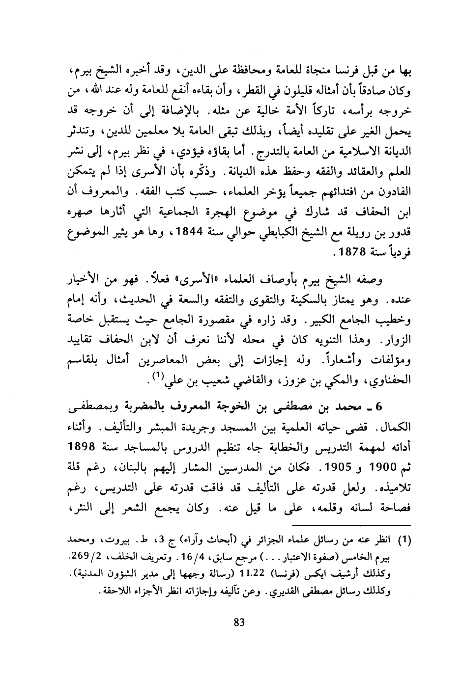 (¬1) انظر عنه من رسائل علماء الجزائر في (أبحاث وآراء) ج 3، ط. بيروت، ومحمد بيرم الخامس (صفوة الاعتبار ...) مرجع سابق، 4/ 16. وتعريف الخلف، 2/ 269. وكذلك أرشيف ايكس (فرنسا) 11.22 (رسالة وجهها إلى مدير الشؤون المدنية). وكذلك رسائل مصطفى القديري. وعن تآليفه وإجازاته انظر الأجزاء اللاحقة.