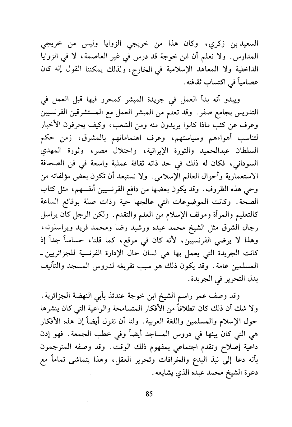 وقد وصف عمر راسم الشيخ ابن خوجة عندئذ بأبي النهضة الجزائرية. ولا شك أن ذلك كان انطلاقا من الأفكار المتسامحة والواعية التي كان ينشرها حول الإسلام والمسلمين واللغة العربية. ولنا أن نقول أيضا إن هذه الأفكار هي التي كان يبثها في دروس المساجد أيضا وفي خطب الجمعة. فهو إذن داعية إصلاح وتقدم اجتماعي بمفهوم ذلك الوقت. وقد وصفه المترجمون بأنه دعا إلى نبذ البدع والخرافات وتحرير العقل، وهذا يتماشى تماما مع دعوة الشيخ محمد عبده الذي يشايعه.