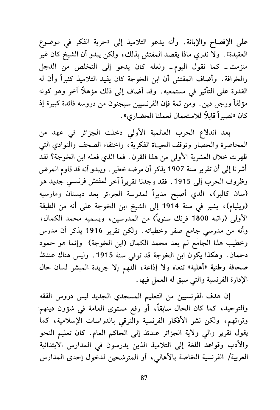 على الإفصاح والإبانة. وأنه يدعو التلاميذ إلى (حرية الفكر في موضوع العقيدة). ولا ندري ماذا يقصد المفتش بذلك، ولكن يبدو أن الشيخ كان غير متزمت - كما نقول اليوم - ولعله كان يدعو إلى التخلص من الدجل والخرافة. وأضاف المفتش أن ابن الخوجة كان يفيد التلاميذ كثيرا وأن له القدرة على التأثير في مستمعيه. وقد أضاف إلى ذلك مؤهلا آخر وهو كونه مؤلفا ورجل دين. ومن ثمة فإن الفرنسيين سيجنون من دروسه فائدة كبيرة إذ كان (نصيرا قابلا للاستعمال لعملنا الحضاري).