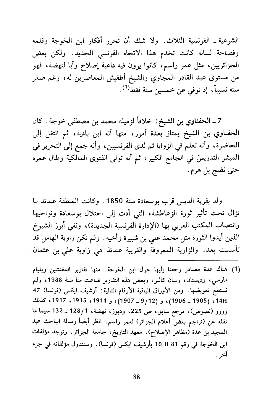 (¬1) هناك عدة مصادر رجعنا إليها حول ابن الخوجة. منها تقارير المفتشين ويليام مارسي، وديستان، وسان كالبر، وبعض هذه التقارير ضاعت منا سنة 1988، ولم نستطع تعويضها. ومن الأوراق الباقية الأرقام التالية: أرشيف ايكس (فرنسا) 47 H 14، (1905 - 1906)، و (12/ 9 - 1907)، و 1914، 1915، 1917، كذلك زوزو (نصوص)، مرجع سابق، ص 225، ودبوز، نهضة، 1/ 128 - 132 سيما ما نقله عن (تراجم بعض أعلام الجزائر) لعمر راسم. انظر أيضا رسالة الباحث عبد المجيد بن عدة (مظاهر الإصلاح)، معهد التاريخ، جامعة الجزائر. وتوجد مؤلفات ابن الخوجة في رقم 81 H 10 بأرشيف ايكس (فرنسا). وسنتناول مؤلفاته في جزء آخر.