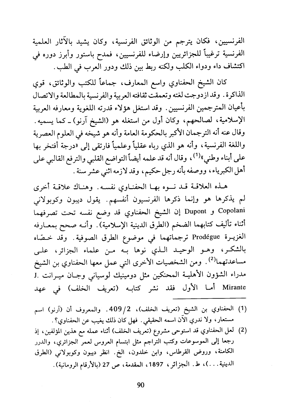(¬1) الحفناوي بن الشيخ (تعريف الخلف)، 2/ 409. والمعروف أن (آرنو) اسم مستعار، ولا ندري الآن اسمه الحقيقي. فهل كان ذلك يغيب عن الحفناوي؟.