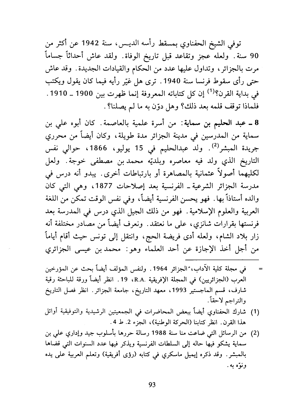8 - عبد الحليم بن سماية: من أسرة علمية بالعاصمة. كان أبوه علي بن سماية من المدرسين في مدينة الجزائر مدة طويلة، وكان أيضا من محرري جريدة المبشر (¬2). ولد عبد الحليم في 15 يوليو، 1866، حوالي نفس التاريخ الذي ولد فيه معاصره وبلديه محمد بن مصطفى خوجة. ولعل لكليهما أصولا عثمانية بالمصاهرة أو بارتباطات أخرى. يبدو أنه درس في مدرسة الجزائر الشرعية - الفرنسية بعد إصلاحات 1877، وهي التي كان والده أستاذا بها. فهو يحسن الفرنسية أيضا، وفي نفس الوقت تمكن من اللغة العربية والعلوم الإسلامية. فهو من ذلك الجيل الذي درس في المدرسة بعد فرنستها بقرارات شأنزي، على ما نعتقد. ونعرف أيضا من مصادر مختلفة أنه زار بلاد الشام، ولعله أدى فريضة الحج، وانتقل إلى تونس حيث أقام أياما من أجل أخذ الإجازة عن أحد العلماء وهو: محمد بن عيسى الجزائري