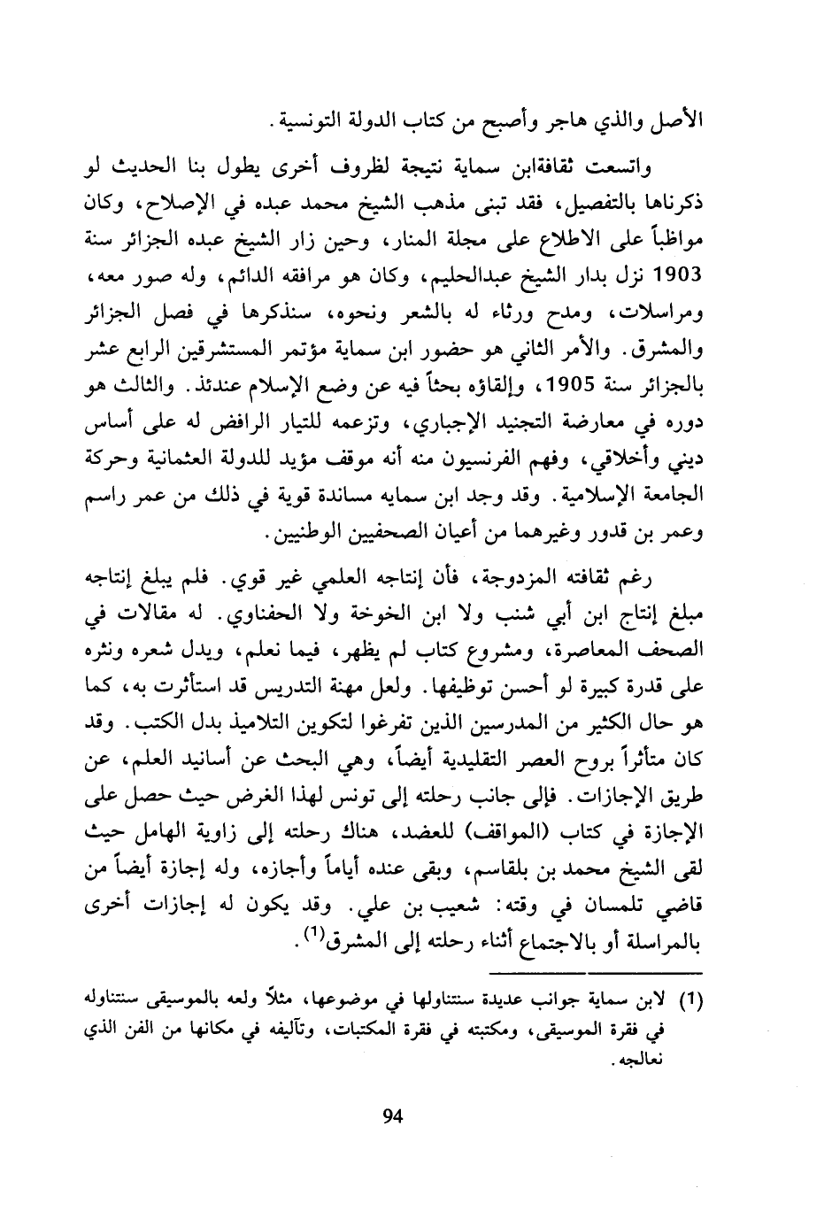 واتسعت ثقافة ابن سماية نتيجة لظروف أخرى يطول بنا الحديث لو ذكرناها بالتفصيل، فقد تبنى مذهب الشيخ محمد عبده في الإصلاح، وكان مواظبا على الاطلاع على مجلة المنار، وحين زار الشيخ عبده الجزائر سنة 1903 نزل بدار الشيخ عبد الحليم، وكان هو مرافقه الدائم، وله صور معه، ومراسلات، ومدح ورثاء له بالشعر ونحوه، سنذكرها في فصل الجزائر والمشرق. والأمر الثاني هو حضور ابن سماية مؤتمر المستشرقين الرابع عشر بالجزائر سنة 1905، وإلقاؤه بحثا فيه عن وضع الإسلام عندئذ. والثالث هو دوره في معارضة التجنيد الإجباري، وتزعمه للتيار الرافض له على أساس ديني وأخلاقي، وفهم الفرنسيون منه أنه موقف مؤيد للدولة العثمانية وحركة الجامعة الإسلامية. وقد وجد ابن سمايه مساندة قوية في ذلك من عمر راسم وعمر بن قدور وغيرهما من أعيان الصحفيين الوطنيين.