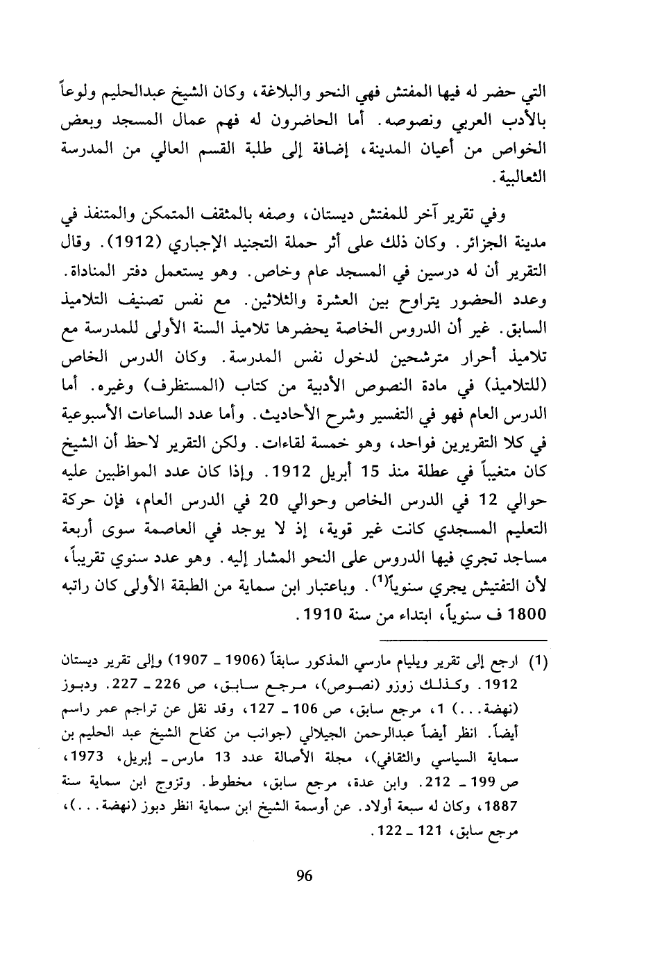 (¬1) ارجع إلى تقرير ويليام مارسي المذكور سابقا (1906 - 1907) وإلى تقرير ديستان 1912. وكذلك زوزو (نصوص)، مرجع سابق، ص 226 - 227. ودبوز (نهضة ...) 1، مرجع سابق، ص 106 - 127، وقد نقل عن تراجم عمر راسم أيضا. انظر أيضا عبد الرحمن الجيلالي (جوانب من كفاح الشيخ عبد الحليم بن سماية السياسي والثقافي)، مجلة الأصالة عدد 13 مارس - إبريل، 1973، ص 199 - 212. وابن عدة، مرجع سابق، مخطوط. وتزوج ابن سماية سنة 1887، وكان له سبعة أولاد. عن أوسمة الشيخ ابن سماية انظر دبوز (نهضة ...)، مرجع سابق، 121 - 122.