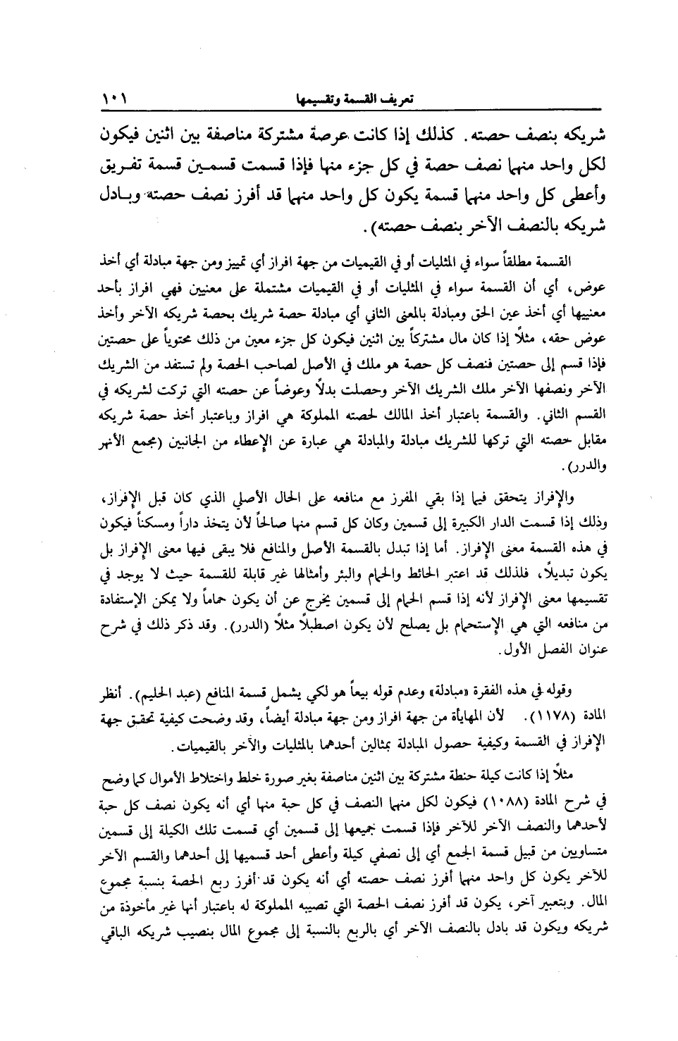 وَقَوْلُهُ فِي هَذِهِ الْفِقْرَةِ (مُبَادَلَةً) وَعَدَمُ قَوْلِهِ: بَيْعًا، هُوَ لِكَيْ يَشْمَلَ قِسْمَةَ الْمَنَافِعِ (عَبْدُ الْحَلِيمِ) . اُنْظُرْ الْمَادَّةَ (1178) ؛ لِأَنَّ الْمُهَايَأَةَ مِنْ جِهَةِ إفْرَازٍ وَمِنْ جِهَةِ مُبَادَلَةٍ أَيْضًا، وَقَدْ وَضَّحْتُ كَيْفِيَّةَ تَحَقُّقِ جِهَةِ الْإِفْرَازِ فِي الْقِسْمَةِ وَكَيْفِيَّةَ حُصُولِ الْمُبَادَلَةِ بِمِثَالَيْنِ أَحَدُهُمَا بِالْمِثْلِيَّاتِ وَالْآخَرُ بِالْقِيَمِيَّاتِ.