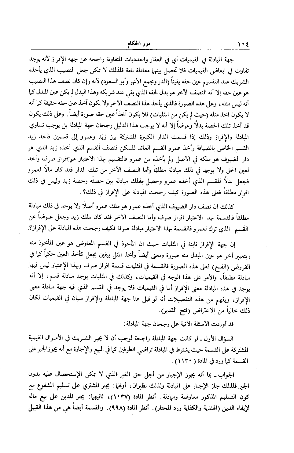 جِهَةُ الْمُبَادَلَةِ فِي الْقِيَمِيَّاتِ أَيْ فِي الْعَقَارِ وَالْعَدَدِيَّاتِ الْمُتَفَاوِتَةِ رَاجِحَةٌ عَنْ جِهَةِ الْإِفْرَازِ؛ لِأَنَّهُ يُوجَدُ تَفَاوُتٌ فِي أَبْعَاضِ الْقِيَمِيَّاتِ فَلَا تَحْصُلُ بَيْنَهُمَا مُعَادَلَةٌ تَامَّةٌ فَلِذَلِكَ لَا يُمْكِنُ جَعْلُ النَّصِيبِ الَّذِي يَأْخُذُهُ الشَّرِيكُ عِنْدَ التَّقْسِيمِ عَيْنَ حَقِّهِ يَقِينًا (الدُّرُّ وَمَجْمَعُ الْأَنْهُرِ وَأَبُو السُّعُودِ) ؛ لِأَنَّهُ وَإِنْ كَانَ نِصْفُ هَذَا النَّصِيبِ هُوَ عَيْنُ حَقِّهِ إلَّا أَنَّهُ النِّصْفُ الْآخَرُ هُوَ بَدَلٌ لِحَقِّهِ الَّذِي بَقِيَ عِنْدَ شَرِيكِهِ وَهَذَا الْبَدَلُ لَمْ يَكُنْ عَيْنَ الْمُبْدَلِ كَمَا أَنَّهُ لَيْسَ مِثْلَهُ، وَعَلَى هَذِهِ الصُّورَةِ فَاَلَّذِي يَأْخُذُ هَذَا النِّصْفُ الْآخَرُ وَلَا يَكُونُ آخِذٌ عَيْنَ حَقِّهِ حَقِيقَةً كَمَا أَنَّهُ لَا يَكُونُ آخِذٌ مِثْلَهُ (حَيْثُ لَمْ يَكُنْ مِنْ الْمِثْلِيَّاتِ) فَلَا يَكُونُ آخِذًا عَيْنَ حَقِّهِ صُورَةً أَيْضًا. وَعَلَى ذَلِكَ يَكُونُ قَدْ أَخَذَ تِلْكَ الْحِصَّةَ بَدَلًا وَعِوَضًا إلَّا أَنَّهُ لَا يُوجِبُ هَذَا الدَّلِيلُ رُجْحَانَ جِهَةِ الْمُبَادَلَةِ بَلْ يُوجِبُ تَسَاوِي الْمُبَادَلَةِ وَالْإِفْرَازِ وَذَلِكَ إذَا قُسِمَتْ الدَّارُ الْكَبِيرَةُ الْمُشْتَرَكَةُ بَيْنَ زَيْدٍ وَعَمْرٍو إلَى قِسْمَيْنِ فَأَخَذَ زَيْدٌ الْقِسْمَ الْخَاصَّ بِالضِّيَافَةِ وَأَخَذَ عَمْرٌو الْقِسْمَ الْعَائِدَ لِلسَّكَنِ فَنِصْفُ الْقِسْمِ الَّذِي أَخَذَهُ زَيْدٌ الَّذِي هُوَ دَارُ الضُّيُوفِ هُوَ مِلْكُهُ فِي الْأَصْلِ وَلَمْ يَأْخُذْهُ مِنْ عَمْرٍو فَالتَّقْسِيمُ بِهَذَا الِاعْتِبَارِ هُوَ إفْرَازُ صَرْفٍ وَأَخْذٍ لِعَيْنِ الْحَقِّ وَلَا يُوجَدُ فِي ذَلِكَ مُبَادَلَةٌ مُطْلَقًا وَأَمَّا النِّصْفُ الْآخَرُ مِنْ تِلْكَ الدَّارِ فَقَدْ كَانَ مَالًا لِعَمْرٍو فَجُعِلَ بَدَلًا لِلْقِسْمِ الَّذِي أَخَذَهُ عَمْرٌو وَحَصَلَ بِذَلِكَ مُبَادَلَةٌ بَيْنَ حِصَّتِهِ وَحِصَّةِ زَيْدٍ وَلَيْسَ فِي ذَلِكَ إفْرَازٌ مُطْلَقًا فَعَلَى هَذِهِ الصُّورَةِ كَيْفَ رُجِّحَتْ الْمُبَادَلَةُ عَلَى الْإِفْرَازِ فِي ذَلِكَ؟ ،.