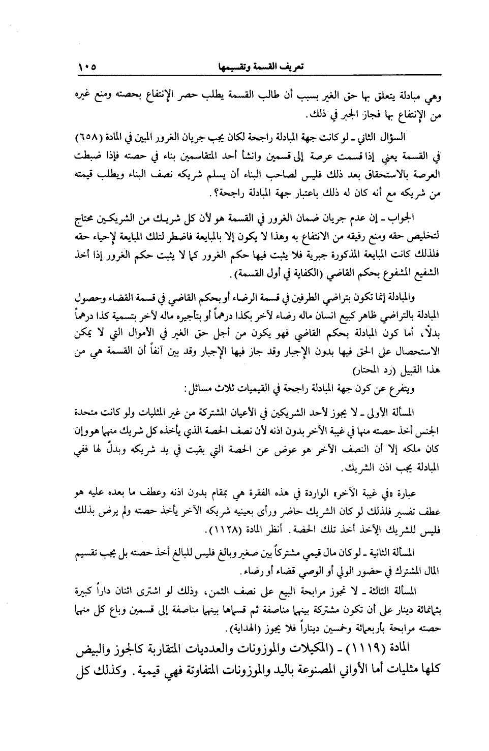 الْجَوَابُ - إنَّ عَدَمَ جَرَيَانِ ضَمَانِ الْغُرُورِ فِي الْقِسْمَةِ هُوَ لِأَنَّ كُلَّ شَرِيكٍ مِنْ الشَّرِيكَيْنِ مُحْتَاجٌ لِتَخْلِيصِ حَقِّهِ وَمَنْعِ رَفِيقِهِ مِنْ الِانْتِفَاعِ بِهِ وَهَذَا لَا يَكُونُ إلَّا بِالْمُبَايَعَةِ فَاضْطَرَّ لِتِلْكَ الْمُبَايَعَةِ لِإِحْيَاءِ حَقِّهِ فَلِذَلِكَ كَانَتْ الْمُبَايَعَةُ الْمَذْكُورَةُ جَبْرِيَّةً فَلَا يَثْبُتُ فِيهَا حُكْمُ الْغُرُورِ كَمَا لَا يَثْبُتُ حُكْمُ الْغُرُورِ إذَا أَخَذَ الشَّفِيعُ الْمَشْفُوعَ بِحُكْمِ الْقَاضِي (الْكِفَايَةُ فِي أَوَّلِ الْقِسْمَةِ) .
