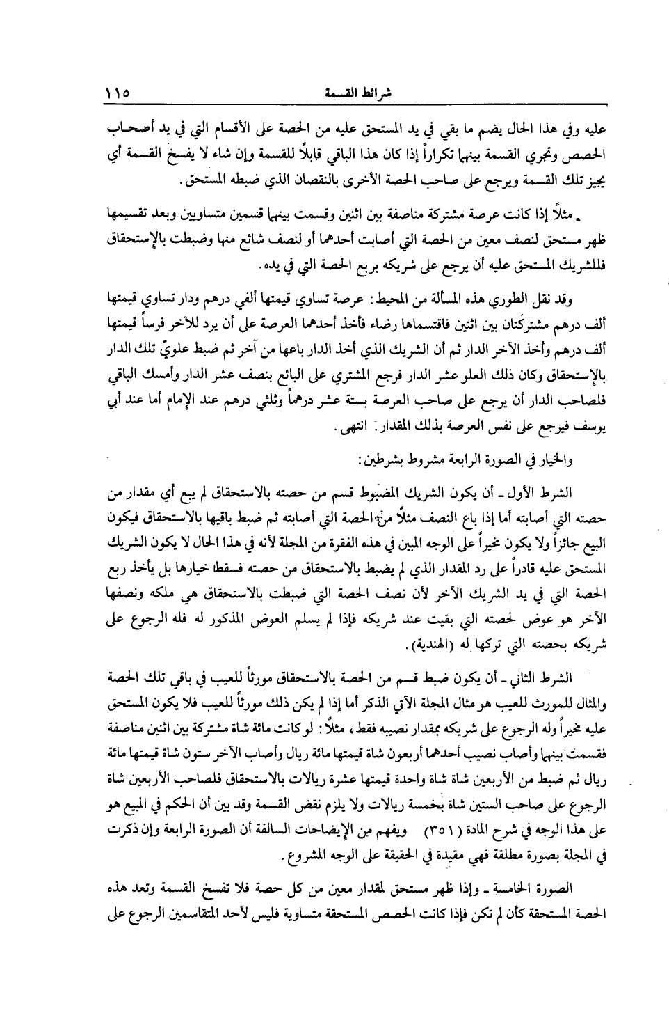 الشَّرْطُ الثَّانِي - أَنْ يَكُونَ ضَبْطُ قِسْمٍ مِنْ الْحِصَّةِ بِالِاسْتِحْقَاقِ مُوَرِّثًا لِلْعَيْبِ فِي بَاقِي تِلْكَ الْحِصَّةِ وَالْمِثَالُ لِلْمُوَرِّثِ لِلْعَيْبِ هُوَ مِثَالُ الْمَجَلَّةِ الْآتِي الذِّكْرُ أَمَّا إذَا لَمْ يَكُنْ ذَلِكَ مُوَرِّثًا لِلْعَيْبِ فَلَا يَكُونُ الْمُسْتَحَقُّ عَلَيْهِ مُخَيَّرًا وَلَهُ الرُّجُوعُ عَلَى شَرِيكِهِ بِمِقْدَارِ نَصِيبِهِ فَقَطْ، مَثَلًا: لَوْ كَانَتْ مِائَةُ شَاةٍ مُشْتَرَكَةً بَيْنَ اثْنَيْنِ مُنَاصَفَةً فَقُسِمَتْ بَيْنَهُمَا وَأَصَابَ نَصِيبَ أَحَدِهِمَا أَرْبَعُونَ شَاةً قِيمَتُهَا مِائَةُ رِيَالٍ وَأَصَابَ الْآخَرَ سِتُّونَ شَاةً قِيمَتُهَا مِائَةُ رِيَالٍ ثُمَّ ضُبِطَ مِنْ الْأَرْبَعِينَ شَاةً شَاةٌ وَاحِدَةٌ قِيمَتُهَا عَشْرَةُ رِيَالَاتٍ بِالِاسْتِحْقَاقِ فَلِصَاحِبِ الْأَرْبَعِينَ شَاةً الرُّجُوعُ عَلَى صَاحِبِ السِّتِّينَ شَاةً بِخَمْسَةِ رِيَالَاتٍ وَلَا يَلْزَمُ نَقْضُ الْقِسْمَةِ وَقَدْ بُيِّنَ أَنَّ الْحُكْمَ فِي الْمَبِيعِ هُوَ عَلَى هَذَا الْوَجْهِ فِي شَرْحِ الْمَادَّةِ (351) وَيُفْهَمُ مِنْ الْإِيضَاحَاتِ السَّالِفَةِ أَنَّ الصُّورَةَ الرَّابِعَةَ وَإِنْ ذُكِرَتْ فِي الْمَجَلَّةِ بِصُورَةٍ مُطْلَقَةٍ فَهِيَ مُقَيَّدَةٌ فِي الْحَقِيقَةِ عَلَى الْوَجْهِ الْمَشْرُوعِ.