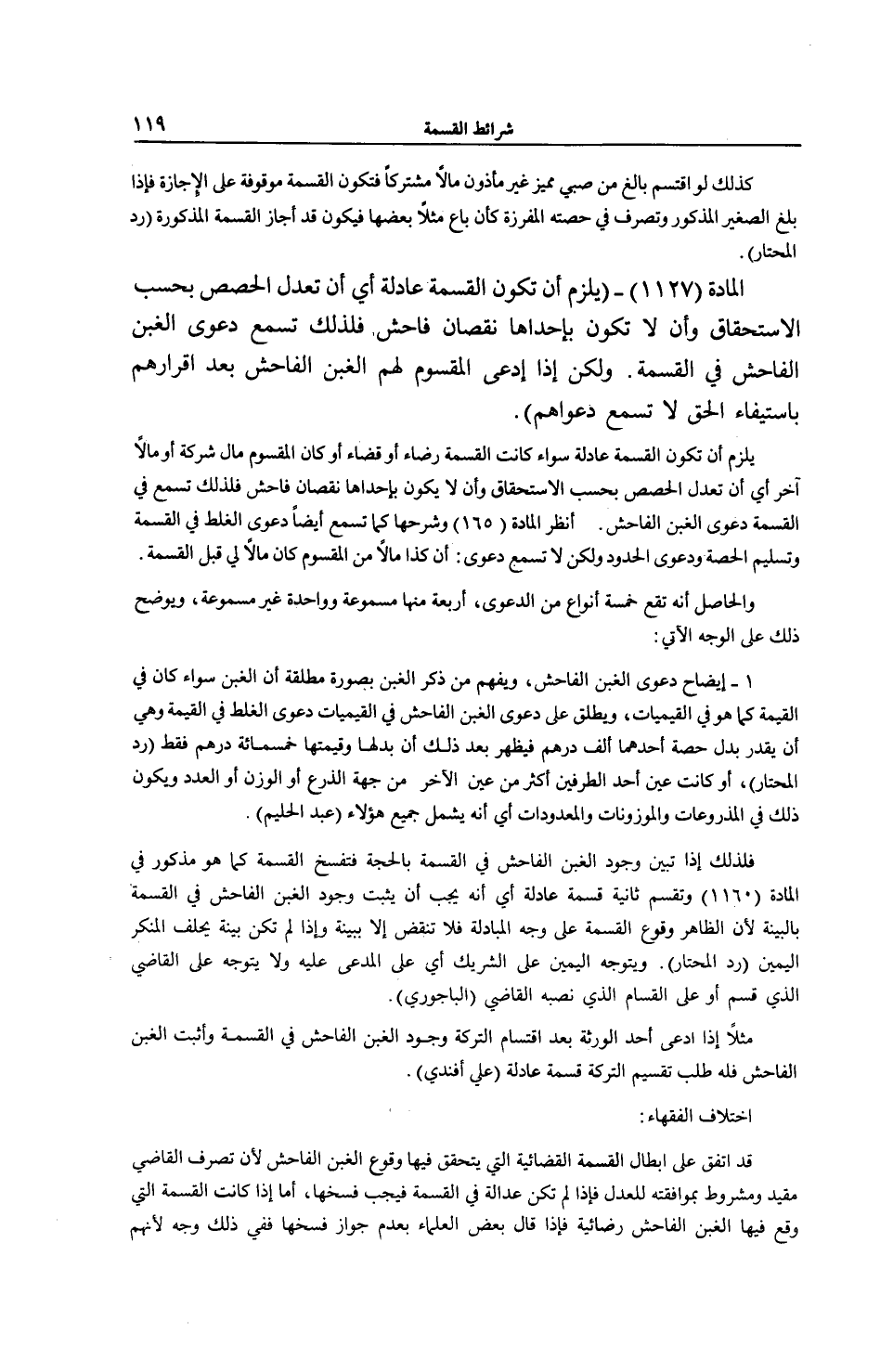 الْمَادَّةُ (1127) - (يَلْزَمُ أَنْ تَكُونَ الْقِسْمَةُ عَادِلَةً أَيْ أَنْ تُعْدَلَ الْحِصَصُ بِحَسَبِ الِاسْتِحْقَاقِ وَأَنْ لَا تَكُونُ بِإِحْدَاهَا نُقْصَانٌ فَاحِشٌ فَلِذَلِكَ تُسْمَعُ دَعْوَى الْغَبْنِ الْفَاحِشِ فِي الْقِسْمَةِ. وَلَكِنْ إذَا ادَّعَى الْمَقْسُومُ لَهُمْ الْغَبْنَ الْفَاحِشَ بَعْدَ إقْرَارِهِمْ بِاسْتِيفَاءِ الْحَقِّ لَا تُسْمَعُ دَعْوَاهُمْ) .