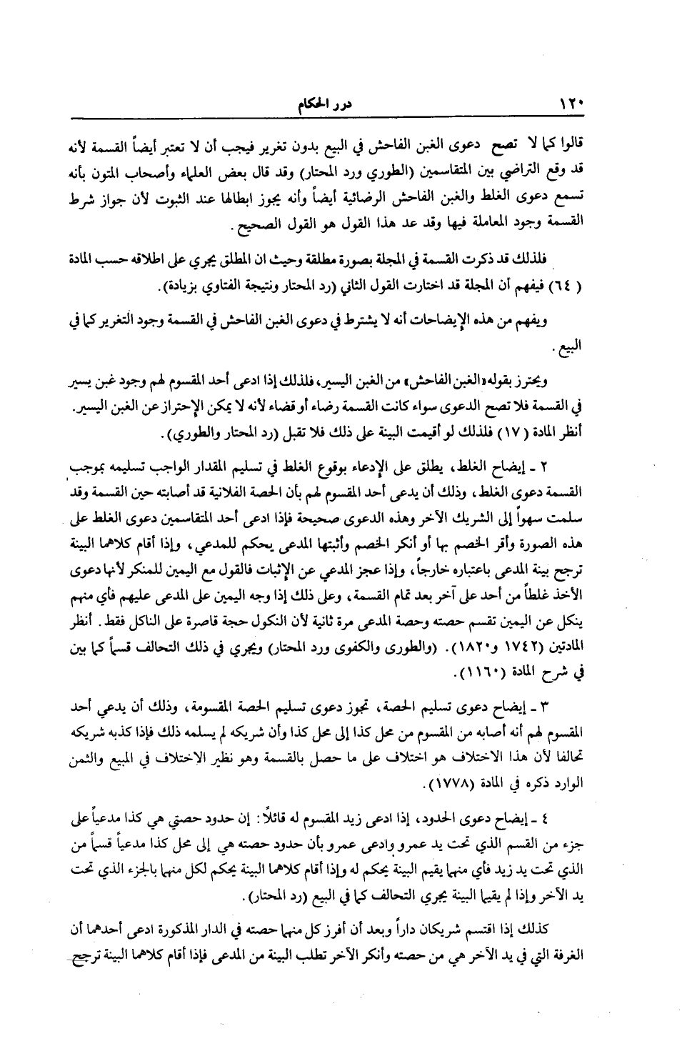 2 - إيضَاحُ الْغَلَطِ، يُطْلَقُ عَلَى الِادِّعَاءِ بِوُقُوعِ الْغَلَطِ فِي تَسْلِيمِ الْمِقْدَارِ الْوَاجِبِ تَسْلِيمُهُ بِمُوجِبِ الْقِسْمَةِ دَعْوَى الْغَلَطِ، وَذَلِكَ أَنْ يَدَّعِيَ أَحَدُ الْمَقْسُومِ لَهُمْ بِأَنَّ الْحِصَّةَ الْفُلَانِيَّةَ قَدْ أَصَابَتْهُ حِينَ الْقِسْمَةِ وَقَدْ سُلِّمَتْ سَهْوًا إلَى الشَّرِيكِ الْآخَرِ وَهَذِهِ الدَّعْوَى صَحِيحَةٌ فَإِذَا ادَّعَى أَحَدُ الْمُتَقَاسِمِينَ دَعْوَى الْغَلَطِ عَلَى هَذِهِ الصُّورَةِ وَأَقَرَّ الْخَصْمُ بِهَا أَوْ أَنْكَرَ الْخَصْمُ وَأَثْبَتَهَا الْمُدَّعِي يُحْكَمُ لِلْمُدَّعِي، وَإِذَا أَقَامَ كِلَاهُمَا الْبَيِّنَةَ تُرَجَّحُ بَيِّنَةُ الْمُدَّعِي بِاعْتِبَارِهِ خَارِجًا، وَإِذَا عَجَزَ الْمُدَّعِي عَنْ الْإِثْبَاتِ فَالْقَوْلُ مَعَ الْيَمِينِ لِلْمُنْكِرِ؛ لِأَنَّهَا دَعْوَى الْأَخْذِ غَلَطًا مِنْ أَحَدٍ عَلَى آخَرَ بَعْدَ تَمَامِ الْقِسْمَةِ، وَعَلَى ذَلِكَ إذَا وُجِّهَ الْيَمِينُ عَلَى الْمُدَّعَى عَلَيْهِمْ فَأَيٌّ مِنْهُمْ يَنْكُلُ عَنْ الْيَمِينِ تُقْسَمُ حِصَّتُهُ وَحِصَّةُ الْمُدَّعِي مَرَّةً ثَانِيَةً؛ لِأَنَّ النُّكُولَ حُجَّةٌ قَاصِرَةٌ عَلَى النَّاكِلِ فَقَطْ. اُنْظُرْ الْمَادَّتَيْنِ (1742 و 1820) . (وَالطُّورِيَّ وَالْكَفَوِيَّ وَرَدَّ الْمُحْتَارِ) وَيَجْرِي فِي ذَلِكَ التَّحَالُفِ قَسَمًا كَمَا بُيِّنَ فِي شَرْحِ الْمَادَّةِ (1160) .