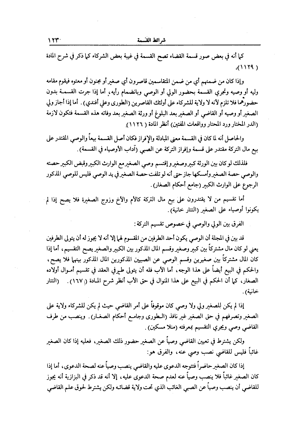 وَإِذَا كَانَ مِنْ ضِمْنِهِمْ أَيْ مِنْ ضِمْنِ الْمُتَقَاسِمِينَ قَاصِرُونَ أَيْ صَغِيرٌ أَوْ مَجْنُونٌ أَوْ مَعْتُوهٌ فَيَقُومُ مَقَامَهُ وَلِيُّهُ أَوْ وَصِيُّهُ وَتَجْرِي الْقِسْمَةُ بِحُضُورِ الْوَلِيِّ أَوْ الْوَصِيِّ وَبِانْضِمَامِ رَأْيِهِ، أَمَّا إذَا جَرَتْ الْقِسْمَةُ بِدُونِ حُضُورِهِمَا فَلَا تَلْزَمُ؛ لِأَنَّهُ لَا وِلَايَةَ لِلشُّرَكَاءِ عَلَى أُولَئِكَ الْقَاصِرِينَ (الطُّورِيُّ وَعَلِيٌّ أَفَنْدِي) . أَمَّا إذَا أَجَازَ وَلِيُّ الصَّغِيرِ أَوْ وَصِيُّهُ أَوْ الْقَاضِي أَوْ الصَّغِيرُ بَعْدَ الْبُلُوغِ أَوْ وَرَثَةُ الصَّغِيرِ بَعْدَ وَفَاتِهِ هَذِهِ الْقِسْمَةَ فَتَكُونُ لَازِمَةً (الدُّرُّ الْمُخْتَارُ وَرَدُّ الْمُحْتَارِ وَوَاقِعَاتُ الْمُفْتِينَ) اُنْظُرْ الْمَادَّةَ (1126) .