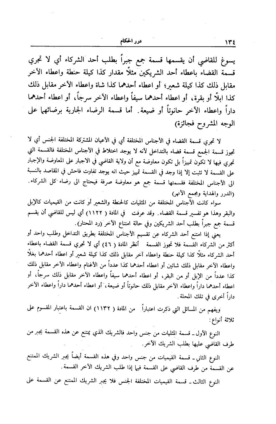 وَيُفْهَمُ مِنْ الْمَسَائِلِ الَّتِي ذُكِرَتْ اعْتِبَارًا مِنْ الْمَادَّةِ (1132) أَنَّ الْقِسْمَةَ بِاعْتِبَارِ الْمَقْسُومِ عَلَى ثَلَاثَةِ أَنْوَاعٍ: النَّوْعُ الْأَوَّلُ - قِسْمَةُ الْمِثْلِيَّاتِ مِنْ جِنْسٍ وَاحِدٍ فَالشَّرِيكُ الَّذِي يَمْتَنِعُ عَنْ هَذِهِ الْقِسْمَةِ يُجْبَرُ مِنْ طَرَفِ الْقَاضِي عَلَيْهَا بِطَلَبِ الشَّرِيكِ الْآخَرِ.