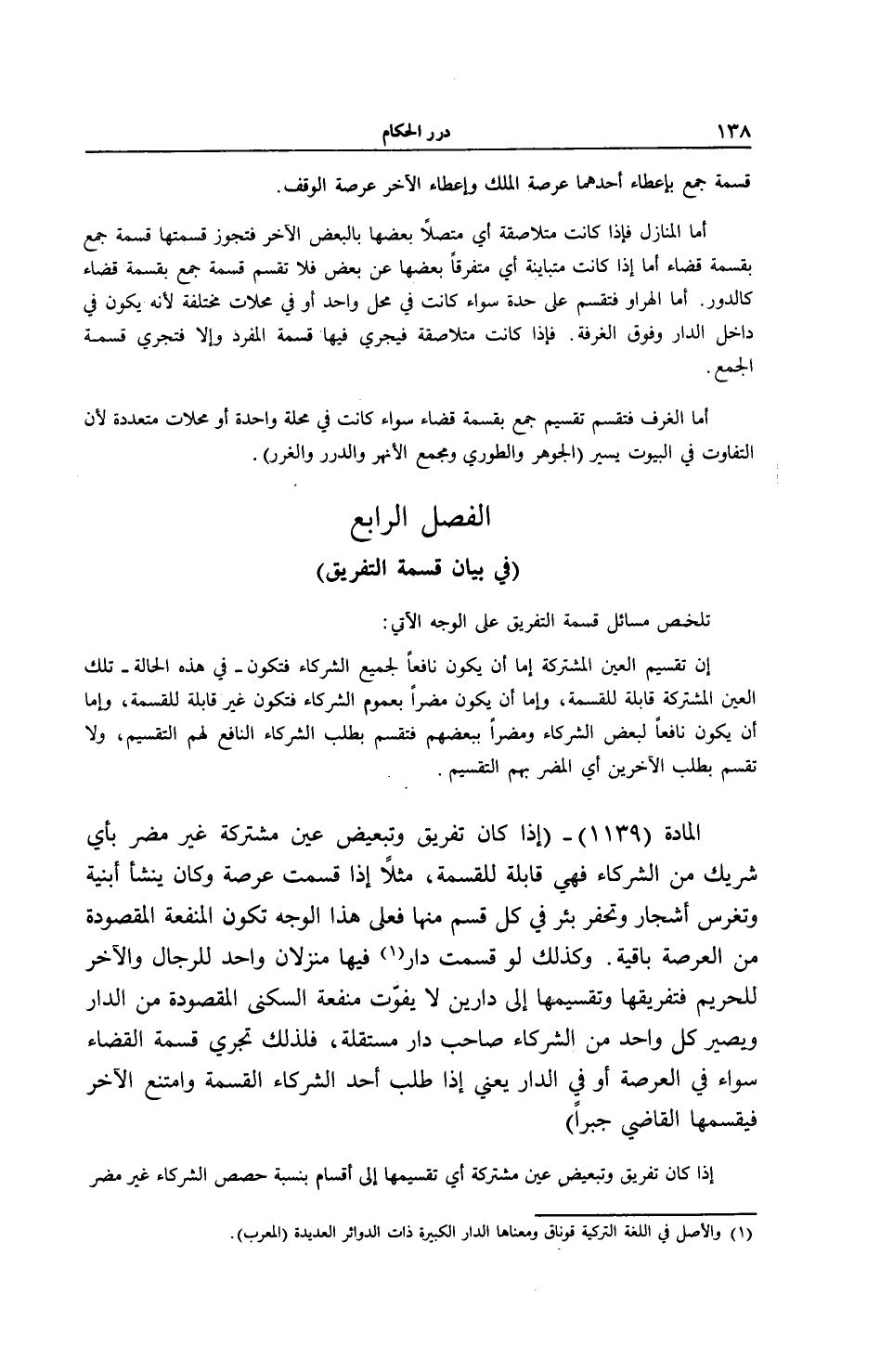 الْمَادَّةُ (1139) - (إذَا كَانَ تَفْرِيقُ وَتَبْعِيضُ عَيْنٍ مُشْتَرَكَةٍ غَيْرَ مُضِرٍّ بِأَيْ شَرِيكٍ مِنْ الشُّرَكَاءِ فَهِيَ قَابِلَةٌ لِلْقِسْمَةِ، مَثَلًا إذَا قُسِّمَتْ عَرْصَةٌ وَكَانَ يُنْشَأُ أَبْنِيَةٌ وَتُغْرَسُ أَشْجَارٌ وَتُحْفَرُ بِئْرٌ فِي كُلِّ قِسْمٍ مِنْهَا فَعَلَى هَذَا الْوَجْهِ تَكُونُ الْمَنْفَعَةُ الْمَقْصُودَةُ مِنْ الْعَرْصَةِ بَاقِيَةً. وَكَذَلِكَ لَوْ قُسِّمَتْ دَارٌ فِيهَا مَنْزِلَانِ وَاحِدٌ لِلرِّجَالِ وَالْآخَرُ لِلْحَرِيمِ فَتَفْرِيقُهَا وَتَقْسِيمُهَا إلَى دَارَيْنِ لَا يُفَوِّتُ مَنْفَعَةَ السُّكْنَى الْمَقْصُودَةَ مِنْ الدَّارِ وَيَصِيرُ كُلُّ وَاحِدٍ مِنْ الشُّرَكَاءِ صَاحِبَ دَارٍ مُسْتَقِلَّةٍ، فَلِذَلِكَ تَجْرِي قِسْمَةُ الْقَضَاءِ، سَوَاءٌ فِي الْعَرْصَةِ أَوْ فِي الدَّارِ، يَعْنِي إذَا طَلَب أَحَدُ الشُّرَكَاءِ الْقِسْمَةَ وَامْتَنَعَ الْآخَرُ فَيُقَسِّمُهَا الْقَاضِي جَبْرًا)