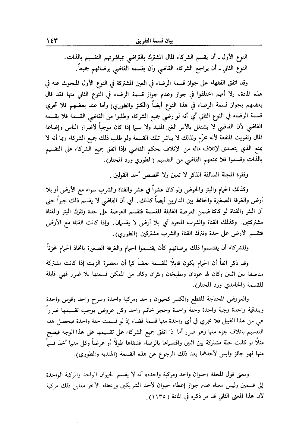 وَمَعْنَى قَوْلِ الْمَجَلَّةِ (حَيَوَانٌ وَاحِدٌ وَمَرْكَبَةٌ وَاحِدَةٌ) أَنَّهُ لَا يُقَسَّمُ الْحَيَوَانُ الْوَاحِدُ وَالْمَرْكَبَةُ الْوَاحِدَةُ إلَى قِسْمَيْنِ وَلَيْسَ مَعْنَاهُ عَدَمَ جَوَازِ إعْطَاءِ حَيَوَانٍ لِأَحَدِ الشَّرِيكَيْنِ وَإِعْطَاءِ الْآخَرِ مُقَابِلَ ذَلِكَ مَرْكَبَةً لِأَنَّ هَذَا الْمَعْنَى الثَّانِي قَدْ مَرَّ ذِكْرُهُ فِي الْمَادَّةِ (1135) .
