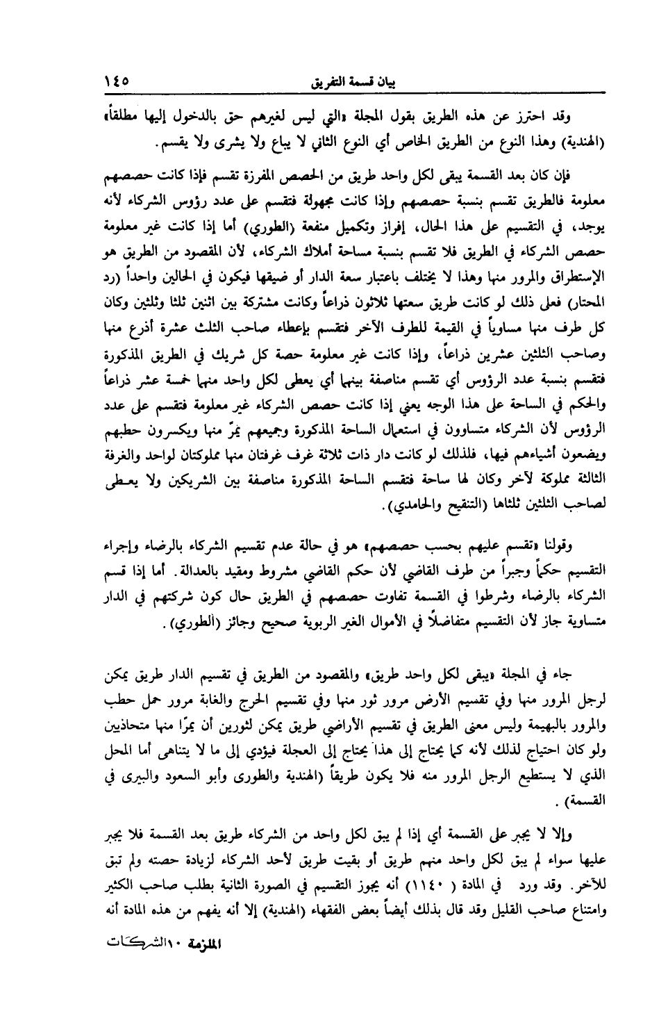 جَاءَ فِي الْمَجَلَّةِ (يَبْقَى لِكُلِّ وَاحِدٍ طَرِيقٌ) وَالْمَقْصُودُ مِنْ الطَّرِيقِ فِي تَقْسِيمِ الدَّارِ طَرِيقٌ يُمْكِنُ لِرَجُلٍ الْمُرُورُ مِنْهَا وَفِي تَقْسِيمِ الْأَرْضِ مُرُورُ ثَوْرٍ مِنْهَا وَفِي تَقْسِيمِ الْحَرَجِ وَالْغَابَةِ مُرُورُ حِمْلِ حَطَبٍ وَالْمُرُورُ بِالْبَهِيمَةِ وَلَيْسَ مَعْنَى الطَّرِيقِ فِي تَقْسِيمِ الْأَرَاضِي طَرِيقٌ يُمْكِنُ لِثَوْرَيْنِ أَنْ يَمُرَّا مِنْهَا مُتَحَاذِيَيْنِ وَلَوْ كَانَ احْتِيَاجٌ لِذَلِكَ لِأَنَّهُ كَمَا يَحْتَاجُ إلَى هَذَا يَحْتَاجُ إلَى الْعَجَلَةِ فَيُؤَدِّي إلَى مَا لَا يَتَنَاهَى أَمَّا الْمَحِلُّ الَّذِي لَا يَسْتَطِيعُ الرَّجُلُ الْمُرُورَ مِنْهُ فَلَا يَكُونُ طَرِيقًا (الْهِنْدِيَّةُ وَالطُّورِيُّ وَأَبُو السُّعُودِ وَالْبِيرِيُّ فِي الْقِسْمَةِ) .