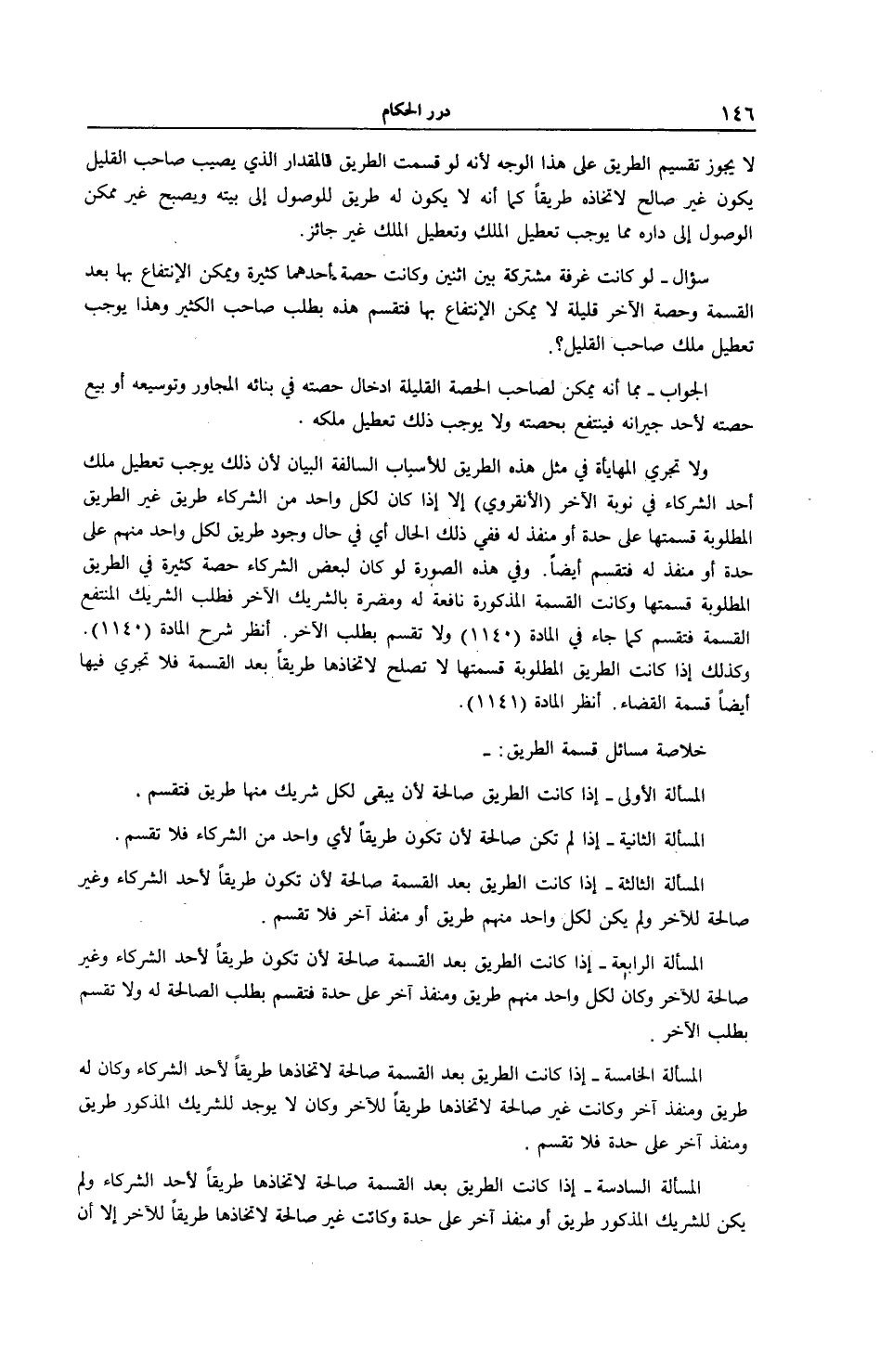 الْجَوَابُ - بِمَا أَنَّهُ يُمْكِنُ لِصَاحِبِ الْحِصَّةِ الْقَلِيلَةِ إدْخَالُ حِصَّتِهِ فِي بِنَائِهِ الْمُجَاوِرِ وَتَوْسِيعِهِ أَوْ بَيْعِ حِصَّتِهِ لِأَحَدِ جِيرَانِهِ فَيَنْتَفِعُ بِحِصَّتِهِ وَلَا يُوجِبُ ذَلِكَ تَعْطِيلَ مِلْكِهِ. وَلَا تَجْرِي الْمُهَايَأَةُ فِي مِثْلِ هَذِهِ الطَّرِيقِ لِلْأَسْبَابِ السَّالِفَةِ الْبَيَانُ لِأَنَّ ذَلِكَ يُوجِبُ تَعْطِيلَ مِلْكِ أَحَدِ الشُّرَكَاءِ فِي نَوْبَةِ الْآخَرِ الْأَنْقِرْوِيُّ.