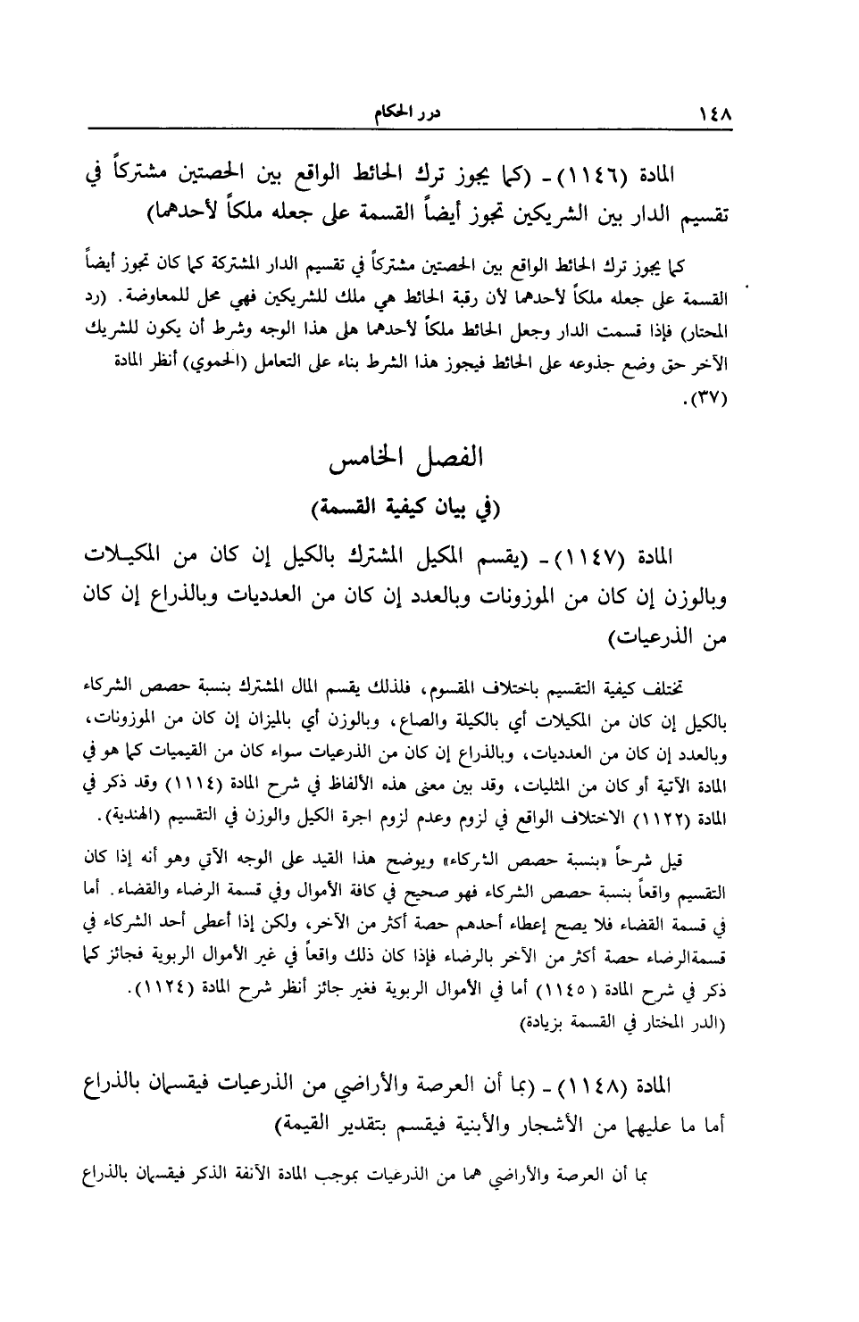 الْمَادَّةُ (1148) - (بِمَا أَنَّ الْعَرْصَةَ وَالْأَرَاضِي مِنْ الذَّرْعِيَّاتِ فَيُقَسَّمَانِ بِالذِّرَاعِ أَمَّا مَا عَلَيْهِمَا مِنْ الْأَشْجَارِ وَالْأَبْنِيَةِ فَيُقَسَّمُ بِتَقْدِيرِ الْقِيمَةِ) .