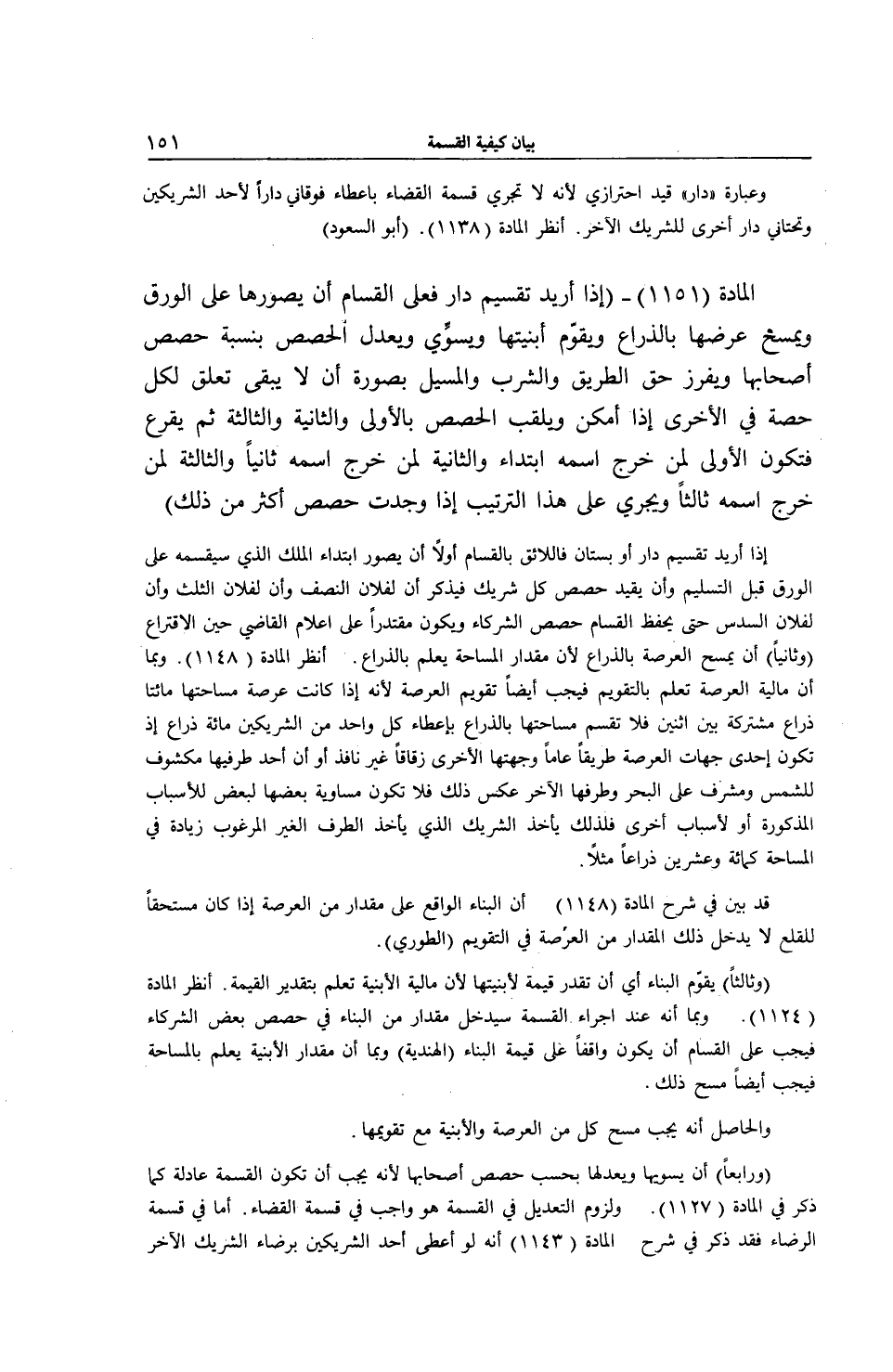 الْمَادَّة (1151) - (إذَا أُرِيدَ تَقْسِيمُ دَارٍ فَعَلَى الْقَسَّامِ أَنْ يُصَوِّرَهَا عَلَى الْوَرِقِ وَيَمْسَحَ عَرْضَهَا بِالذِّرَاعِ وَيُقَوِّمَ أَبْنِيَتِهَا وَيُسَوِّيَ وَيُعَدِّلَ الْحِصَصَ بِنِسْبَةِ حِصَصِ أَصْحَابِهَا وَيَفْرِزَ حَقَّ الطَّرِيقِ وَالشُّرْبِ وَالْمَسِيلِ بِصُورَةِ أَنْ لَا يَبْقَى تَعَلُّقٌ لِكُلِّ حِصَّةٍ فِي الْأُخْرَى إذَا أَمْكَنَ وَيُلَقِّبَ الْحِصَصَ بِالْأُولَى وَالثَّانِيَةِ وَالثَّالِثَةِ ثُمَّ يُقْرِعَ فَتَكُونُ الْأُولَى لِمَنْ خَرَجَ اسْمُهُ ابْتِدَاءً وَالثَّانِيَةُ لِمَنْ خَرَجَ اسْمُهُ ثَانِيًا وَالثَّالِثَةُ لِمَنْ خَرَجَ اسْمُهُ ثَالِثًا وَيَجْرِي عَلَى هَذَا التَّرْتِيبِ إذَا وُجِدَتْ حِصَصٌ أَكْثَرُ مِنْ ذَلِكَ) .