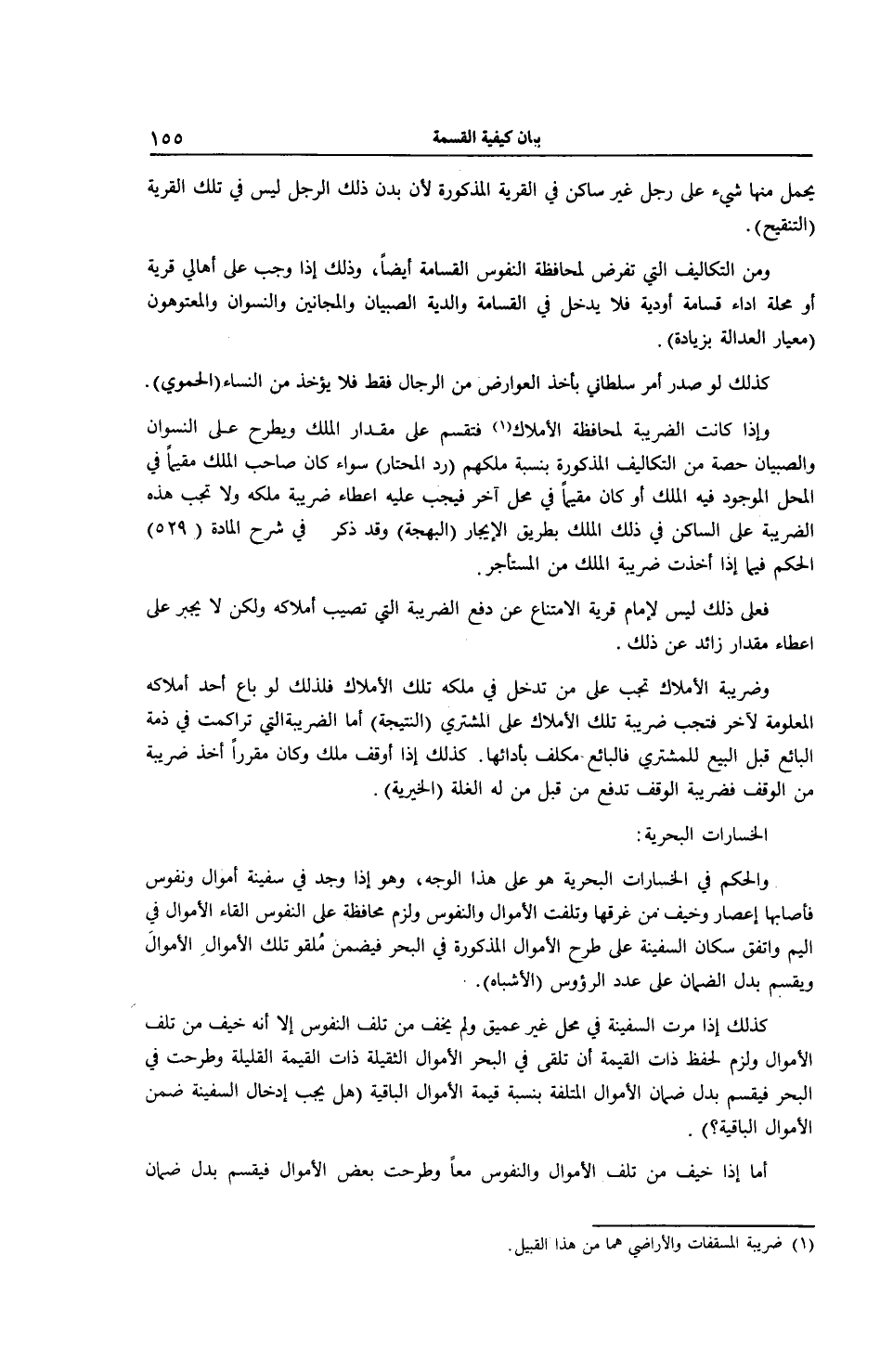 الْخَسَارَاتُ الْبَحْرِيَّةُ: وَالْحُكْمُ فِي الْخَسَارَاتِ الْبَحْرِيَّةِ هُوَ عَلَى هَذَا الْوَجْهِ، وَهُوَ إذَا وُجِدَ فِي سَفِينَةٍ أَمْوَالٌ وَنُفُوسٌ فَأَصَابَهَا إعْصَارٌ وَخِيفَ مِنْ غَرَقِهَا وَتَلِفَتْ الْأَمْوَالُ وَالنُّفُوسُ وَلَزِمَ مُحَافَظَةً عَلَى النُّفُوسِ إلْقَاءُ الْأَمْوَالِ فِي الْيَمِّ وَاتَّفَقَ سُكَّانُ السَّفِينَةِ عَلَى طَرْحِ الْأَمْوَالِ الْمَذْكُورَةِ فِي الْبَحْرِ فَيَضْمَنُ مُلْقُو تِلْكَ الْأَمْوَالِ الْأَمْوَالَ وَيُقَسَّمُ بَدَلُ الضَّمَانِ عَلَى عَدَدِ الرُّءُوسِ (الْأَشْبَاهُ) .