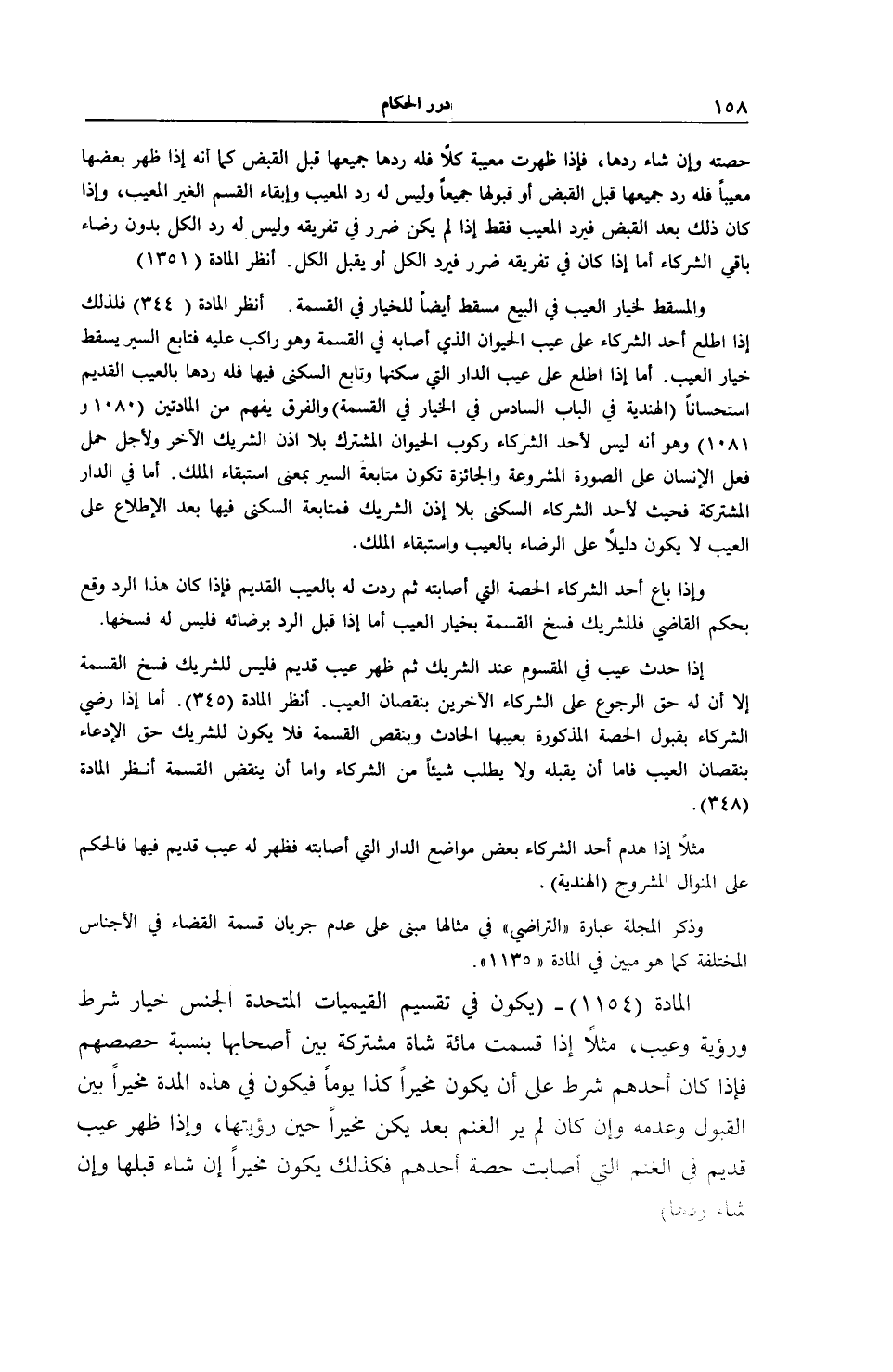 مَثَلًا إذَا هَدَمَ أَحَدُ الشُّرَكَاءِ بَعْضَ مَوَاضِعِ الدَّارِ الَّتِي أَصَابَتْهُ فَظَهَرَ لَهُ عَيْبٌ قَدِيمٌ فِيهَا فَالْحُكْمُ عَلَى الْمِنْوَالِ الْمَشْرُوحِ (الْهِنْدِيَّةُ) . وَذِكْرُ الْمَجَلَّةُ عِبَارَةَ (التَّرَاضِي) فِي مِثَالِهَا مَبْنِيٌّ عَلَى عَدَمِ جَرَيَانِ قِسْمَةِ الْقَضَاءِ فِي الْأَجْنَاسِ الْمُخْتَلِفَةِ كَمَا هُوَ مُبِينٌ فِي الْمَادَّةِ (1135) .