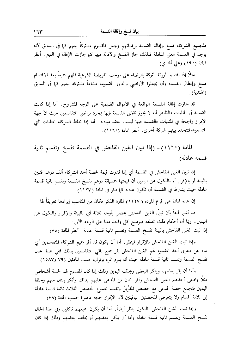 الْمَادَّةُ (1160) - (إذَا تَبَيَّنَ الْغَبْنُ الْفَاحِشُ فِي الْقِسْمَةِ تُفْسَخُ وَتُقَسَّمُ ثَانِيَةً قِسْمَةً عَادِلَةً) .