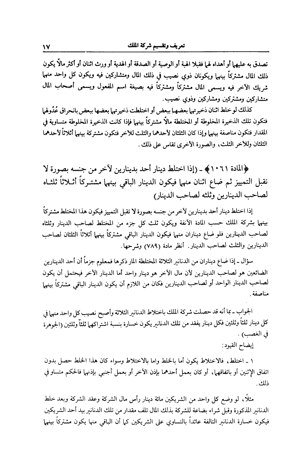 [ (الْمَادَّةُ 1061) اخْتَلَطَ دِينَارُ أَحَدٍ بِدِينَارَيْنِ لِآخَرَ مِنْ جِنْسِهِ ثُمَّ ضَاعَ اثْنَانِ مِنْهُمَا]