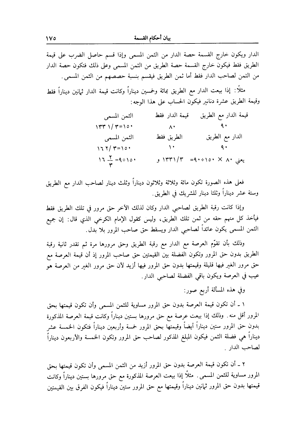 مَثَلًا: إذَا بِيعَتْ الدَّارُ مَعَ الطَّرِيقِ بِمِائَةٍ وَخَمْسِينَ دِينَارًا وَكَانَتْ قِيمَةُ الدَّارِ ثَمَانِينَ دِينَارًا فَقَطْ وَقِيمَةُ الطَّرِيقِ عَشَرَةَ دَنَانِيرَ فَيَكُونُ الْحِسَابُ عَلَى هَذَا الْوَجْهِ: قِيمَةُ الدَّارِ مَعَ الطَّرِيقِ قِيمَةُ الدَّارِ فَقَطْ الثَّمَنُ الْمُسَمَّى 90 80 150 3 133 الدَّارُ مَعَ الطَّرِيقِ الطَّرِيقُ فَقَطْ الثَّمَنُ الْمُسَمَّى 90 10 150 3 16 يَعْنِي 80 150 90 3 1331 و 150 9 2 3 16 فَعَلَى هَذِهِ الصُّورَةِ تَكُونُ مِائَةٌ وَثَلَاثَةٌ وَثَلَاثُونَ دِينَارًا وَثُلُثُ دِينَارٍ لِصَاحِبِ الدَّارِ مَعَ الطَّرِيقِ وَسِتَّةَ عَشَرَ دِينَارًا وَثُلُثَا دِينَارٍ لِلشَّرِيكِ فِي الطَّرِيقِ.