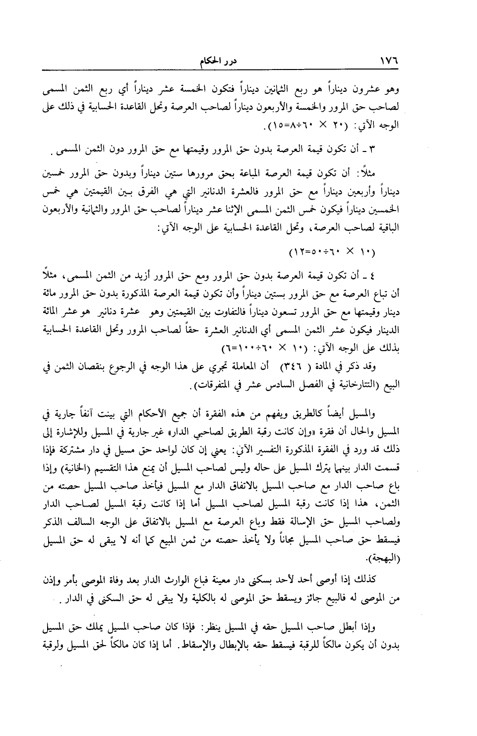 4 - أَنْ تَكُونَ قِيمَةُ الْعَرْصَةِ بِدُونِ حَقِّ الْمُرُورِ وَمَعَ حَقِّ الْمُرُورِ أَزْيَدَ مِنْ الثَّمَنِ الْمُسَمَّى، مَثَلًا أَنْ تُبَاعَ الْعَرْصَةُ مَعَ حَقِّ الْمُرُورِ بِسِتِّينَ دِينَارًا وَأَنْ تَكُونَ قِيمَةُ الْعَرْصَةِ الْمَذْكُورَةِ بِدُونِ حَقِّ الْمُرُورِ مِائَةَ دِينَارٍ وَقِيمَتُهَا مَعَ حَقِّ الْمُرُورِ تِسْعُونَ دِينَارًا فَالتَّفَاوُتُ بَيْنَ الْقِيمَتَيْنِ وَهُوَ عَشَرَةُ دَنَانِيرَ هُوَ عُشْرُ الْمِائَةِ الدِّينَارِ فَيَكُونُ عُشْرُ الثَّمَنِ الْمُسَمَّى أَيْ الدَّنَانِيرُ الْعَشَرَةُ حَقًّا لِصَاحِبِ الْمُرُورِ وَتُحَلُّ الْقَاعِدَةُ الْحِسَابِيَّةُ بِذَلِكَ عَلَى الْوَجْهِ الْآتِي: (10 60 100 6) ، وَقَدْ ذُكِرَ فِي الْمَادَّةِ (346) أَنَّ الْمُعَامَلَةَ تَجْرِي عَلَى هَذَا الْوَجْهِ فِي الرُّجُوعِ بِنُقْصَانِ الثَّمَنِ فِي الْبَيْعِ (التَّتَارْخَانِيَّة فِي الْفَصْلِ السَّادِسَ عَشَرَ فِي الْمُتَفَرِّقَاتِ) .