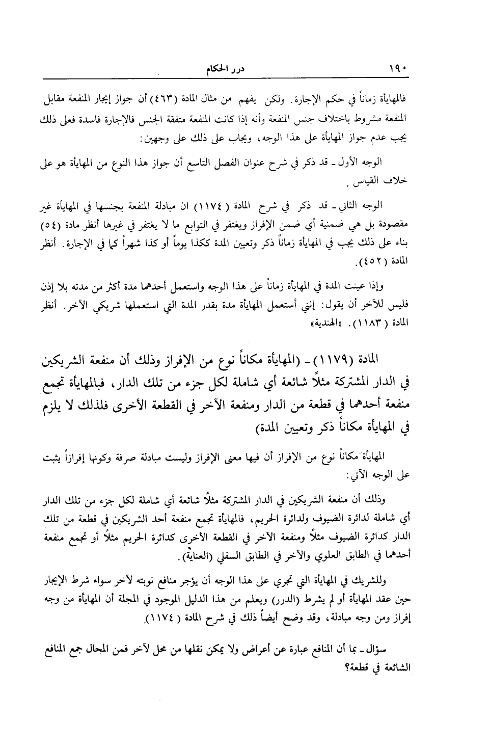 الْوَجْهُ الثَّانِي - قَدْ ذُكِرَ فِي شَرْحِ الْمَادَّةِ (1174) أَنَّ مُبَادَلَةَ الْمَنْفَعَةِ بِجِنْسِهَا فِي الْمُهَايَأَةِ غَيْرُ مَقْصُودَةٍ بَلْ هِيَ ضِمْنِيَّةٌ أَيْ ضِمْنُ الْإِفْرَازِ وَيُغْتَفَرُ فِي التَّوَابِعِ مَا لَا يُغْتَفَرُ فِي غَيْرِهَا اُنْظُرْ مَادَّةَ (54) بِنَاءً عَلَى ذَلِكَ يَجِبُ فِي الْمُهَايَأَةِ زَمَانًا ذِكْرُ وَتَعْيِينُ الْمُدَّةِ كَكَذَا يَوْمًا أَوْ كَذَا شَهْرًا كَمَا فِي الْإِجَارَةِ. اُنْظُرْ الْمَادَّةَ (452) .