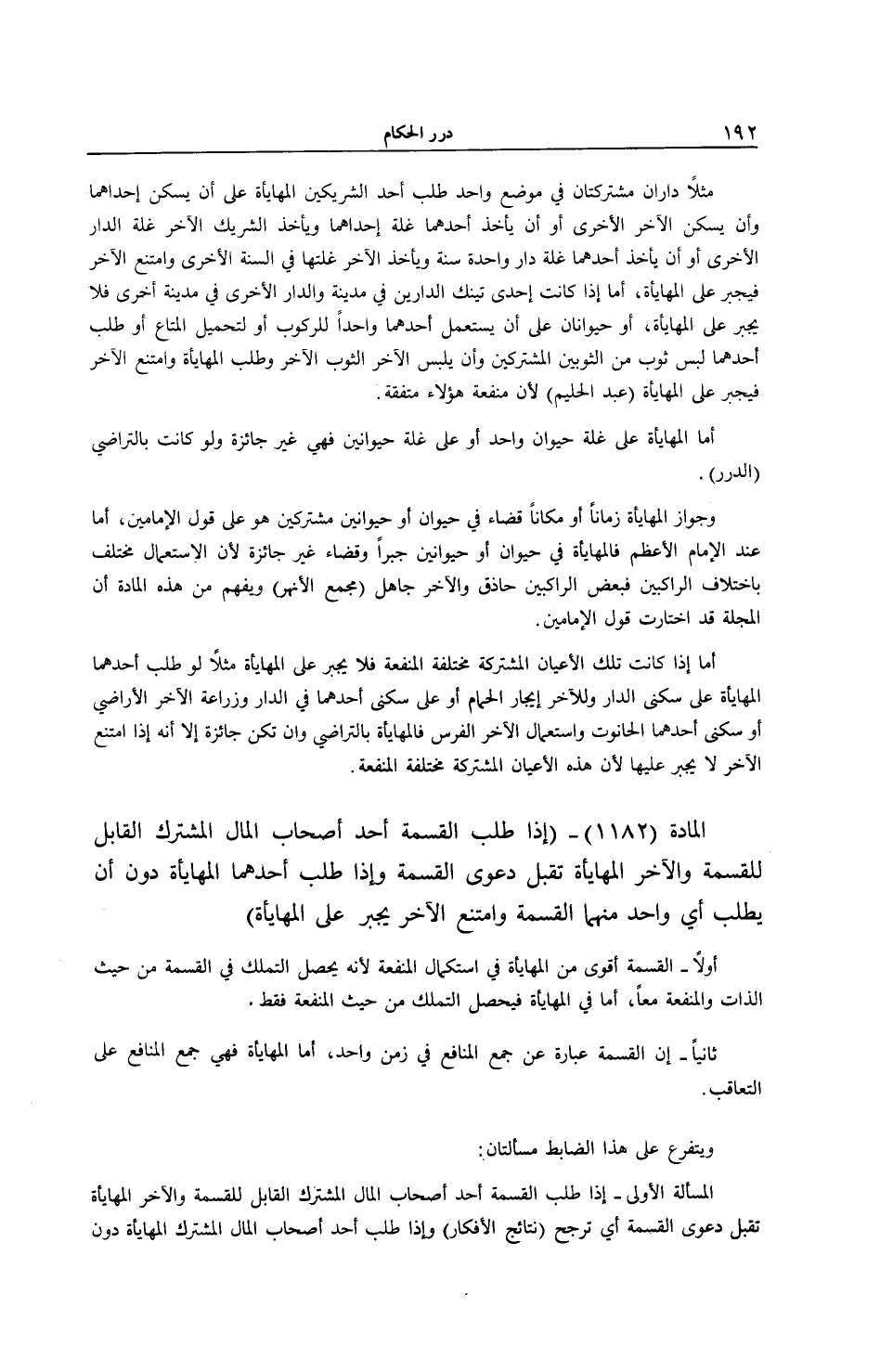 وَجَوَازُ الْمُهَايَأَةِ زَمَانًا أَوْ مَكَانًا قَضَاءً فِي حَيَوَانٍ أَوْ حَيَوَانَيْنِ مُشْتَرَكَيْنِ هُوَ عَلَى قَوْلِ الْإِمَامَيْنِ، أَمَّا عِنْدَ الْإِمَامِ الْأَعْظَمِ فَالْمُهَايَأَةُ فِي حَيَوَانٍ أَوْ حَيَوَانَيْنِ جَبْرًا وَقَضَاءً غَيْرُ جَائِزَةٍ لِأَنَّ الِاسْتِعْمَالَ مُخْتَلِفٌ بِاخْتِلَافِ الرَّاكِبَيْنِ فَبَعْضُ الرَّاكِبَيْنِ حَاذِقٌ وَالْآخَرُ جَاهِلٌ (مَجْمَعُ الْأَنْهُرِ) وَيُفْهَمُ مِنْ هَذِهِ الْمَادَّةِ أَنَّ الْمَجَلَّةَ قَدْ اخْتَارَتْ قَوْلَ الْإِمَامَيْنِ.