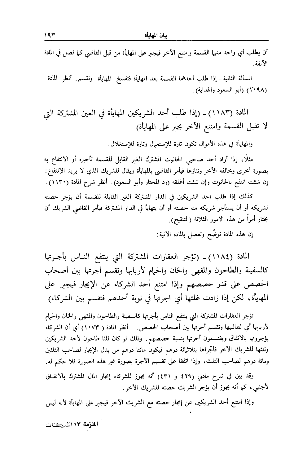 [ (الْمَادَّةُ 1183) طَلَبَ أَحَدُ الشَّرِيكَيْنِ الْمُهَايَأَةَ وَامْتَنَعَ الْآخَرُ]