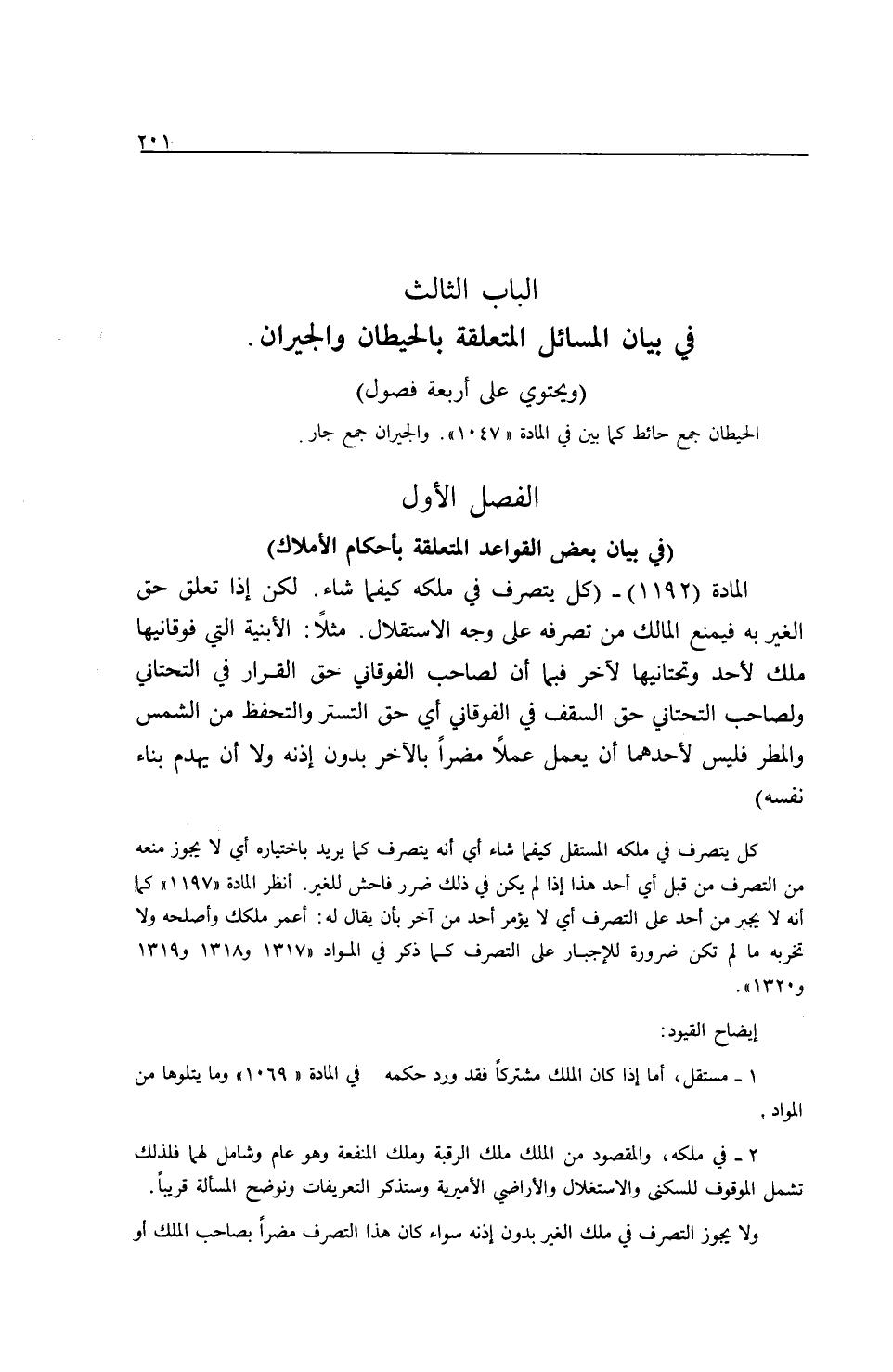 الْمَادَّةُ (1192) - (كُلٌّ يَتَصَرَّفُ فِي مِلْكِهِ كَيْفَمَا شَاءَ. لَكِنْ إذَا تَعَلَّقَ حَقُّ الْغَيْرِ بِهِ فَيُمْنَعُ الْمَالِكُ مِنْ تَصَرُّفِهِ عَلَى وَجْهِ الِاسْتِقْلَالِ. مَثَلًا: الْأَبْنِيَةُ الَّتِي فَوْقَانِيِّهَا مِلْكٌ لِأَحَدٍ وَتَحْتَانِيِّهَا لِآخَرَ فَبِمَا أَنَّ لِصَاحِبِ الْفَوْقَانِيِّ حَقُّ الْقَرَارِ فِي التَّحْتَانِيِّ وَلِصَاحِبِ التَّحْتَانِيِّ حَقُّ السَّقْفِ فِي الْفَوْقَانِيِّ أَيْ حَقُّ التَّسَتُّرِ وَالتَّحَفُّظِ مِنْ الشَّمْسِ وَالْمَطَرِ فَلَيْسَ لِأَحَدِهِمَا أَنْ يَعْمَلَ عَمَلًا مُضِرًّا بِالْآخَرِ بِدُونِ إذْنِهِ وَلَا أَنْ يَهْدِمَ بِنَاءَ نَفْسِهِ) .