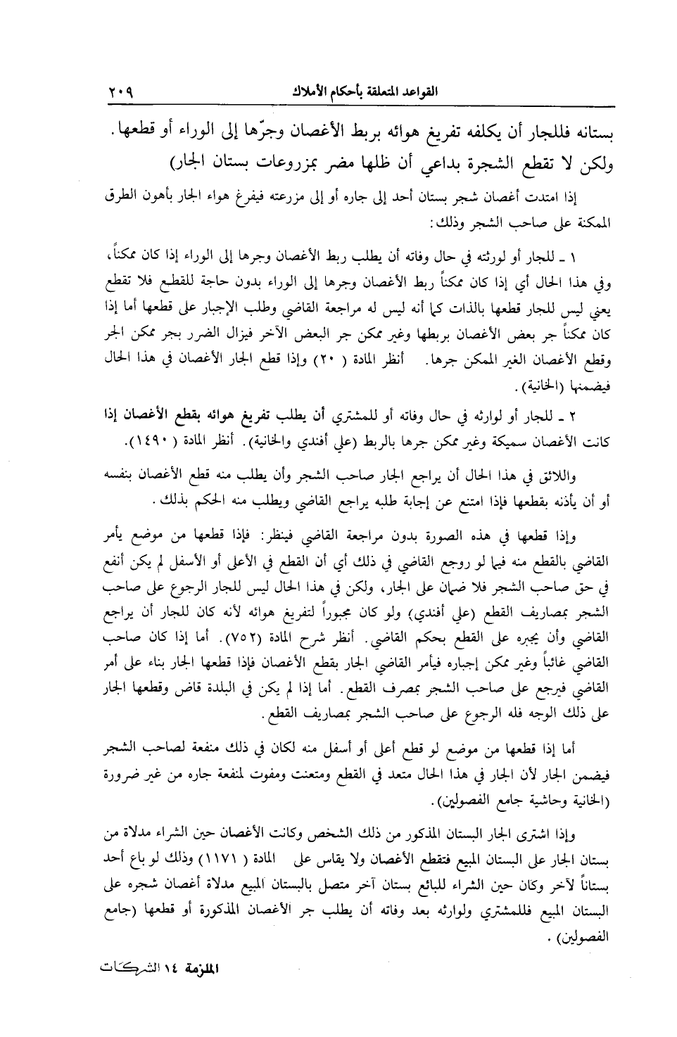 1 - لِلْجَارِ أَوْ لِوَرَثَتِهِ فِي حَالِ وَفَاتِهِ أَنْ يَطْلُبَ رَبْطَ الْأَغْصَانِ وَجَرِّهَا إلَى الْوَرَاءِ إذَا كَانَ مُمْكِنًا، وَفِي هَذَا الْحَالِ أَيْ إذَا كَانَ مُمْكِنًا رَبْطُ الْأَغْصَانِ وَجَرُّهَا إلَى الْوَرَاءِ بِدُونِ حَاجَةٍ لِلْقَطْعِ فَلَا تُقْطَعُ يَعْنِي لَيْسَ لِلْجَارِ قَطْعُهَا بِالذَّاتِ كَمَا أَنَّهُ لَيْسَ لَهُ مُرَاجَعَةُ الْقَاضِي وَطَلَبُ الْإِجْبَارِ عَلَى قَطْعِهَا أَمَّا إذَا كَانَ مُمْكِنًا جَرُّ بَعْضِ الْأَغْصَانِ بِرَبْطِهَا وَغَيْرَ مُمْكِنٍ جَرُّ الْبَعْضِ الْآخَرِ فَيُزَالُ الضَّرَرُ بِجَرِّ مُمْكِنِ الْجَرِّ وَقَطْعِ الْأَغْصَانِ الْغَيْرِ الْمُمْكِنِ جَرُّهَا. اُنْظُرْ الْمَادَّةَ (20) . وَإِذَا قَطَعَ الْجَارُ الْأَغْصَانَ فِي هَذَا الْحَالِ فَيَضْمَنُهَا (الْخَانِيَّةُ) .