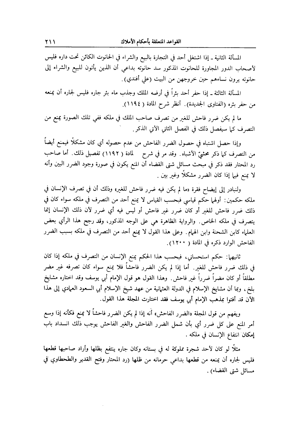 أَوَّلُهُمَا حُكْمٌ قِيَاسِيٌّ فَبِحَسْبِ الْقِيَاسِ لَا يُمْنَعُ أَحَدٌ مِنْ التَّصَرُّفِ فِي مِلْكِهِ سَوَاءٌ كَانَ فِي ذَلِكَ ضَرَرٌ فَاحِشٌ لِلْغَيْرِ أَوْ كَانَ ضَرَرٌ غَيْرُ فَاحِشٍ أَوْ لَيْسَ فِيهِ أَيُّ ضَرَرٍ لِأَنَّ ذَلِكَ الْإِنْسَانَ إنَّمَا يَتَصَرَّفُ فِي مِلْكِهِ الْخَاصِّ وَالرِّوَايَةُ الظَّاهِرَةُ هِيَ عَلَى الْوَجْهِ الْمَذْكُورِ، وَقَدْ رَجَّحَ هَذَا الرَّأْيَ بَعْضُ الْعُلَمَاءِ كَابْنِ الشِّحْنَةِ وَابْنِ الْهُمَامِ. وَعَلَى هَذَا الْقَوْلِ لَا يُمْنَعُ أَحَدٌ مِنْ التَّصَرُّفِ فِي مِلْكِهِ بِسَبَبِ الضَّرَرِ الْفَاحِشِ الْوَارِدِ ذِكْرُهُ فِي الْمَادَّةِ (1200) .