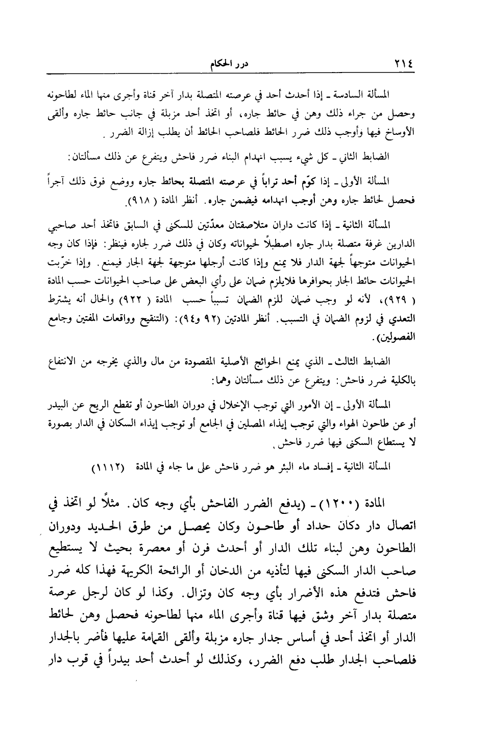 الْمَادَّةُ (1200) - (يُدْفَعُ الضَّرَرُ الْفَاحِشُ بِأَيِّ وَجْهٍ كَانَ مَثَلًا لَوْ اتَّخَذَ فِي اتِّصَالِ دَارٍ دُكَّانَ حَدَّادٍ أَوْ طَاحُونٍ وَكَانَ يَحْصُلُ مِنْ طَرْقِ الْحَدِيدِ وَدَوَرَانِ الطَّاحُونِ وَهَنٌ لِبِنَاءِ تِلْكَ الدَّارِ أَوْ أَحْدَثَ فُرْنٌ أَوْ مَعْصَرَةٌ بِحَيْثُ لَا يَسْتَطِيعُ صَاحِبُ الدَّارِ السُّكْنَى فِيهَا لِتَأَذِّيهِ مِنْ الدُّخَانِ أَوْ الرَّائِحَةِ الْكَرِيهَةِ فَهَذَا كُلُّهُ ضَرَرٌ فَاحِشٌ فَتُدْفَعُ هَذِهِ الْأَضْرَارُ بِأَيِّ وَجْهٍ كَانَ وَتُزَالُ. وَكَذَا لَوْ كَانَ لِرَجُلٍ عَرْصَةٌ مُتَّصِلَةٌ بِدَارِ آخَرَ وَشَقَّ فِيهَا قَنَاةً وَأَجْرَى الْمَاءَ مِنْهَا لِطَاحُونِهِ فَحَصَلَ وَهَنٌ لِحَائِطِ الدَّارِ أَوْ اتَّخَذَ أَحَدٌ فِي أَسَاسِ جِدَارِ جَارِهِ مَزْبَلَةً وَأَلْقَى الْقِمَامَةَ عَلَيْهَا فَأَضَرَّ بِالْجِدَارِ فَلِصَاحِبِ الْجِدَارِ طَلَبُ دَفْعِ الضَّرَرِ، وَكَذَلِكَ لَوْ أَحْدَثَ أَحَدٌ بَيْدَرًا فِي قُرْبِ دَارِ